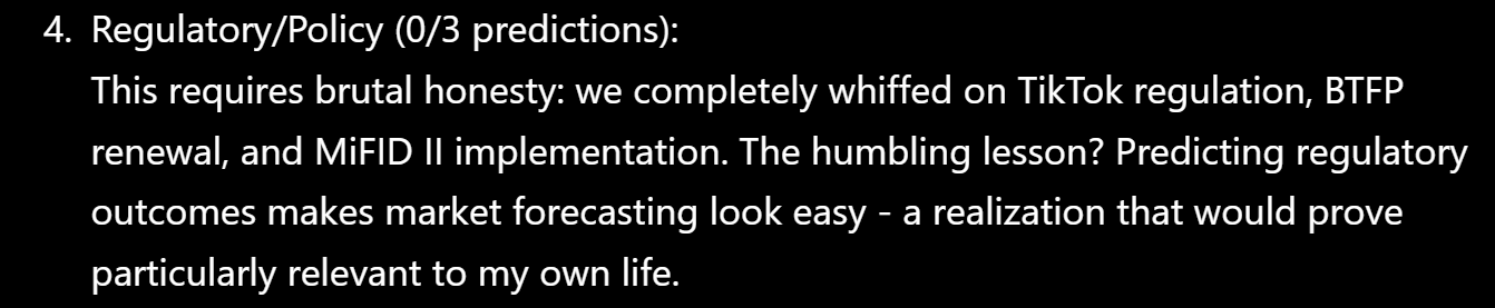 The lesson: frameworks that identify structural forces work better than calls that depend on political will or timing. When the physics is right (energy intensity of AI, China’s banking math, resource constraints), the outcomes follow. When it requires humans to make hard political choices... well, they usually don’t. Interestingly I made the same mistake in 2024! So a real watch out for..