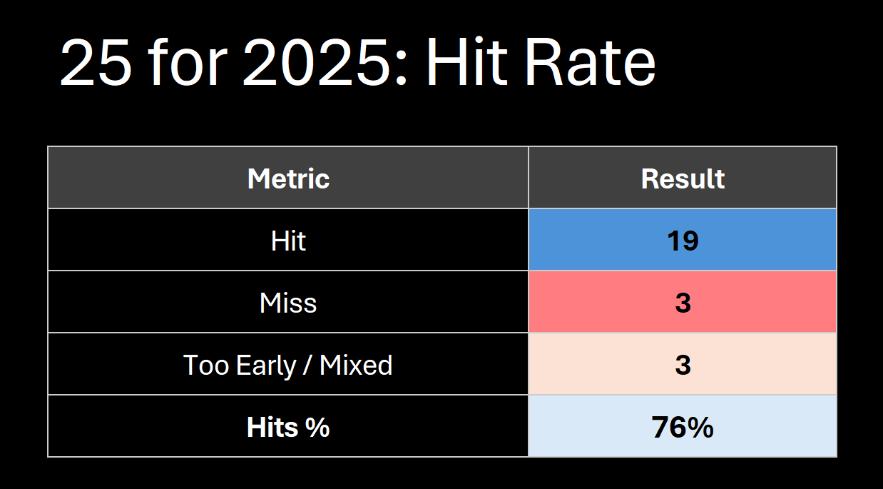 The methodology here is straightforward. I asked multiple AI models to independently score each prediction against observable outcomes. Where they disagreed, I went to the data. Where data was ambiguous, I erred toward being hard on myself. The goal isn’t to claim victory laps—it’s to understand where my frameworks worked and where they didn’t.