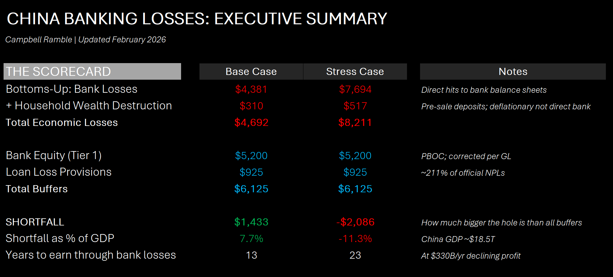 The Chinese banking system is sitting on somewhere between $4.4 trillion (base case) and $7.7 trillion (stress) in direct losses. Losses that haven’t been recognized and are being actively concealed through extend-and-pretend lending, shadow banking, and regulatory forbearance. (All USD conversions at ~7.1 RMB/USD unless noted)