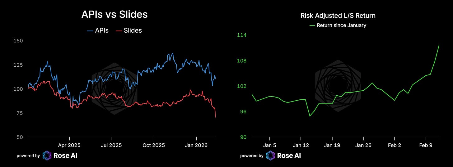 Paired against our bombed-out "API" basket (the infrastructure plays that got crushed in the DeepSeek panic) on a vol-adjusted basis, the long/short has generated ~10% alpha in a week.