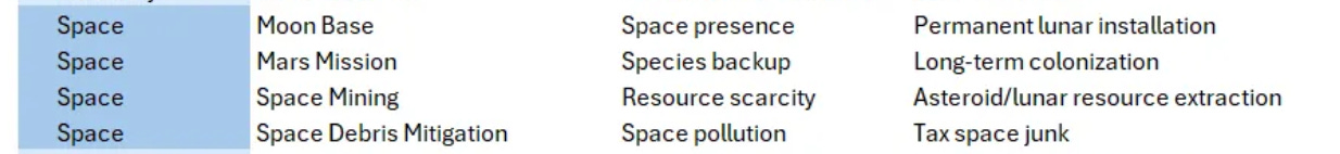 Pretty much the only one selling optimism is Musk, pitching moon bases. Which recall, was point 1 in the Space portfolio of our new new deal….