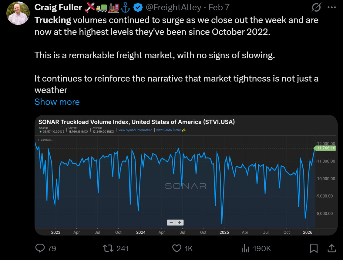 Meanwhile Twitter is full of contradictory signals. Trucking indices at multi-year highs: