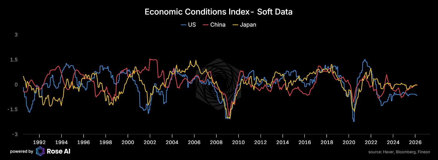 Soft data in the US - consumer confidence, PMI, ISM, business conditions - barely recovered from 2023 lows.