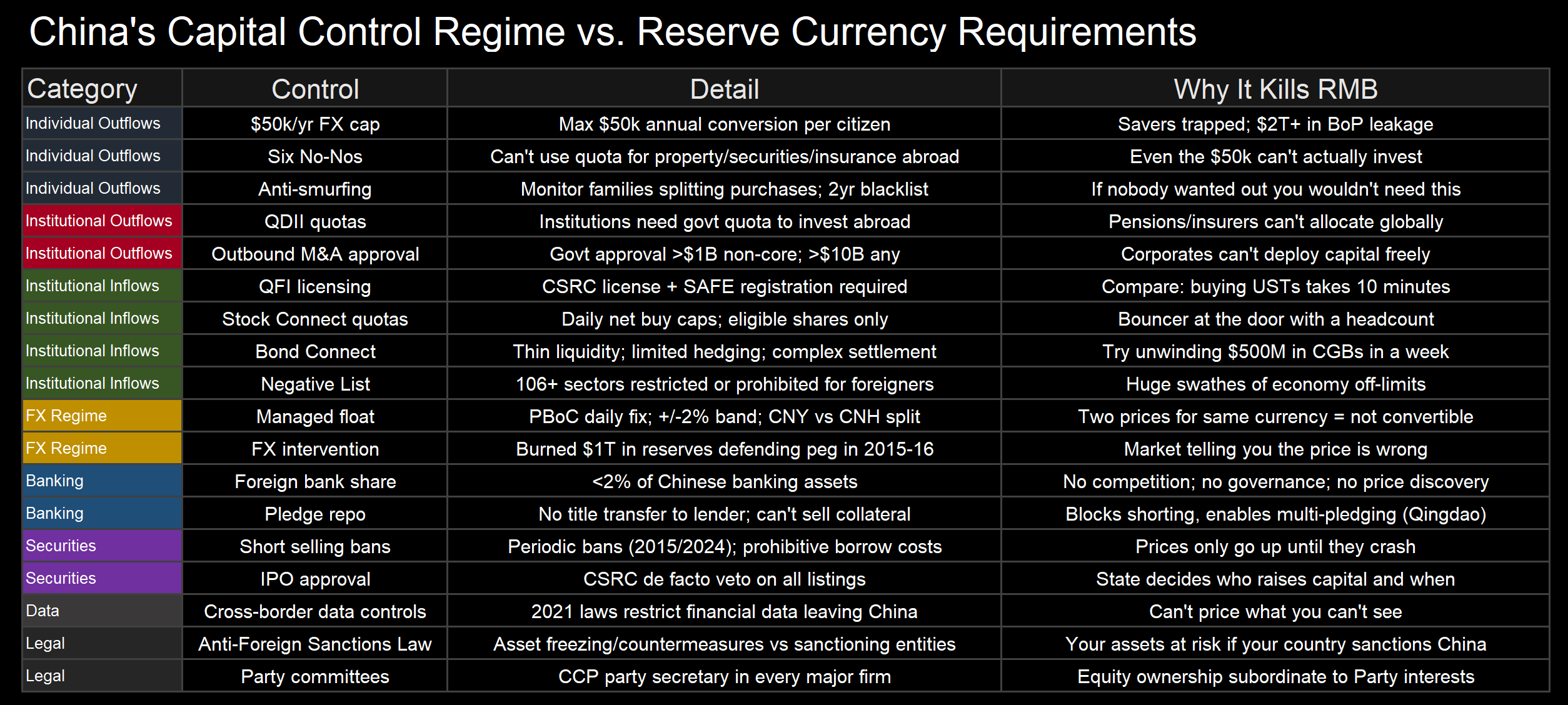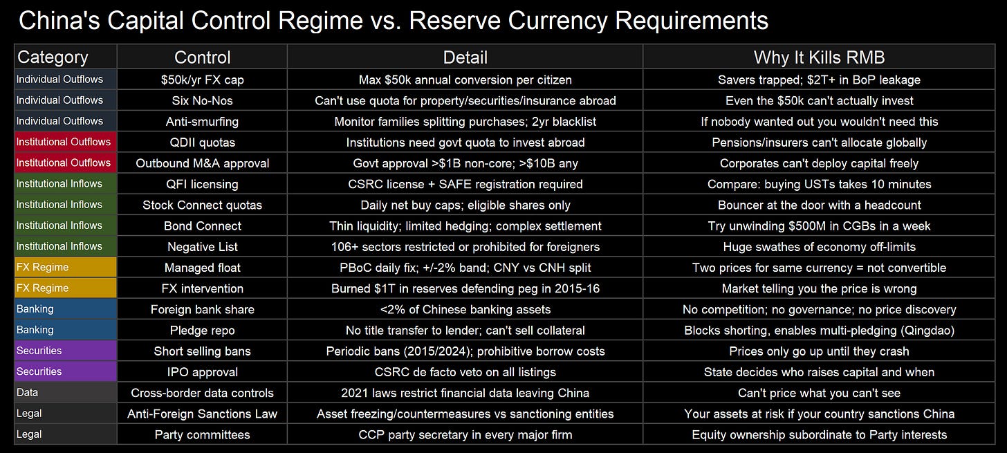 This “minimum viable work” criterion adds a fourth leg to the classic monetary criteria of store of value, unit of account, and means of exchange. And it’s the one that kills the RMB story, because the entire Chinese financial system is designed to maximize the work required to move money.