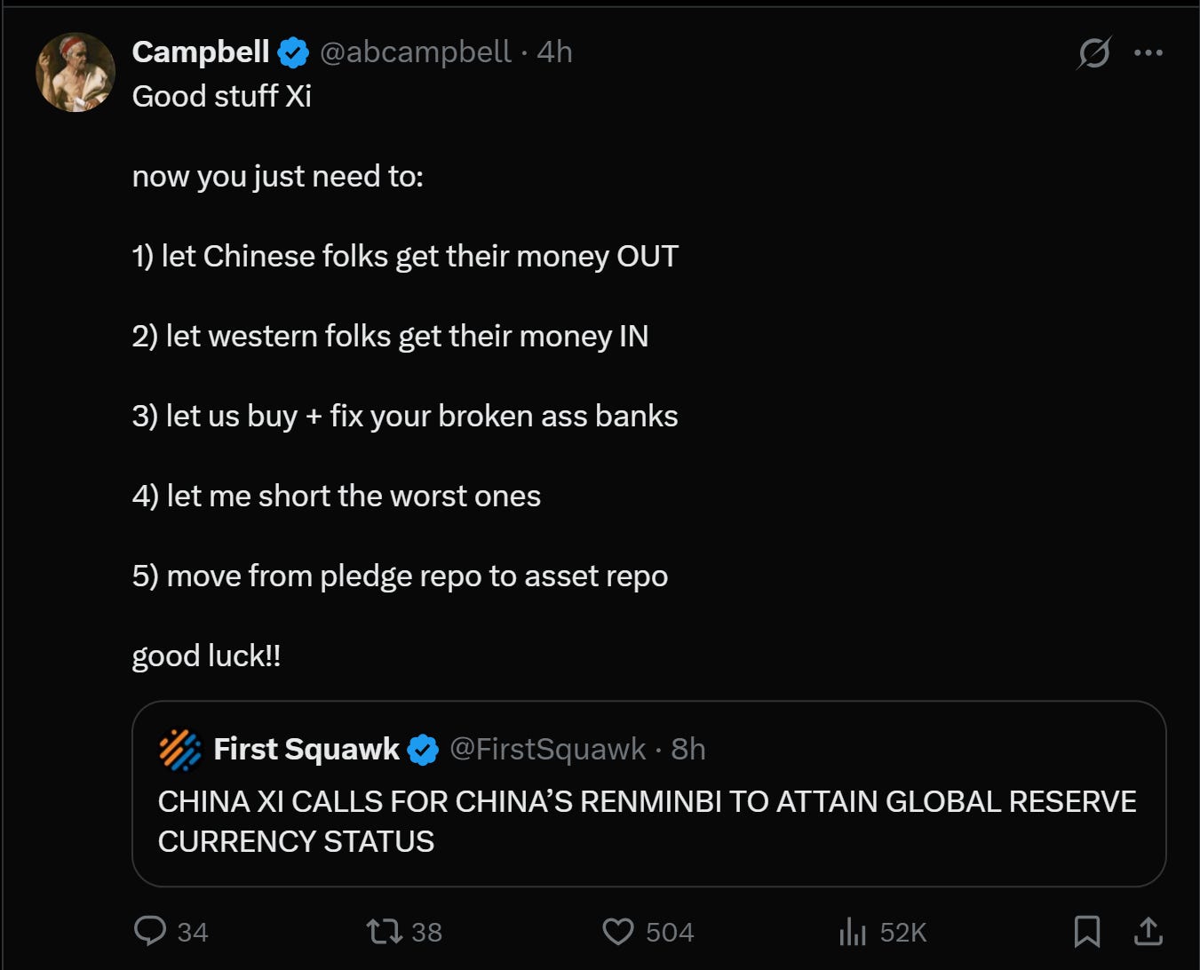 Every single step requires the CCP to cede control over the one thing it considers most essential to regime survival: the direction and allocation of domestic capital. Let money out? Lose control of savings. Let money in? Lose control of the narrative. Let foreigners fix banks? Lose control of credit allocation. Let them short? Lose control of prices. Move to real repo? Lose control of collateral.