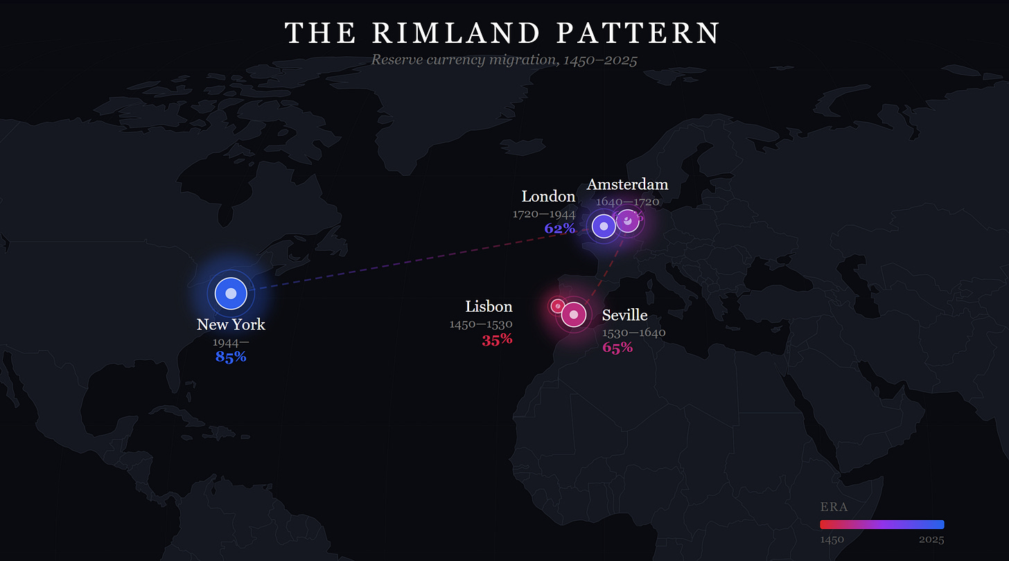 This is why, as we’ve discussed in our Rimland analysis, reserve currencies emerge from international financial centers like Amsterdam, London, New York, Hong Kong. Places where capital — both monetary and human — feels at home. Places where it feels safe. Not because the state commands it, but because the system invites it.