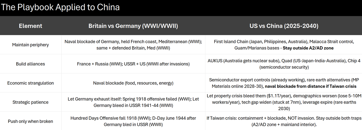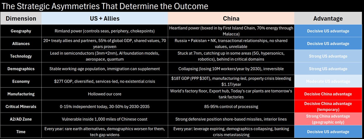 Execution requires two things. First: a strategy for applying peripheral pressure without triggering the Heartland trap. What does “chaos from position of strength” actually look like in practice? How do you force them into impossible choices without starting a war you don’t want? Second: fixing our vulnerabilities during the 2025-2030 window. Critical minerals, technology gaps, manufacturing capacity—what needs to happen before their window closes?