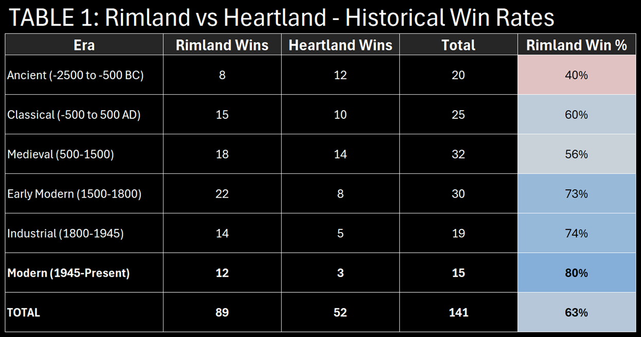 The trend is unmistakable, and the Rimland advantage has grown over time. In ancient times, Heartland powers actually won more often (60%). Land-based empires—Persians, Assyrians, Mongols—could project power through sheer manpower and interior lines.