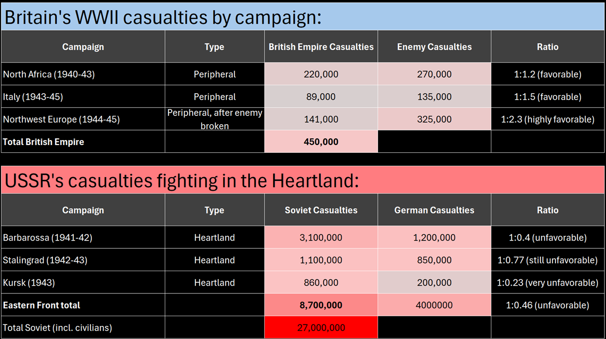 The Rimland powers combined lost less than 1 million. The Heartland power fighting Germany in the interior lost 10 times that. Both won. One did it at 1/10th the cost.