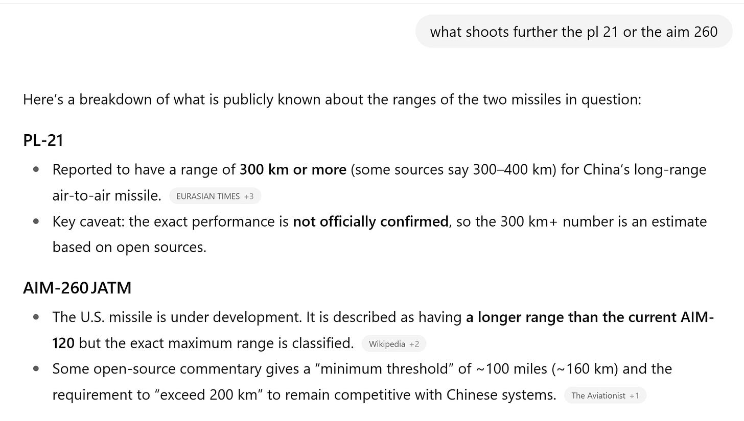 Taiwan sits 100 miles from mainland China—within DF-21D range, within DF-26 range, within Chinese submarine patrol areas, within 5-10 minute flight times from shore bases. That’s before we get to the part where their air-to-air missiles may shoot further than ours.