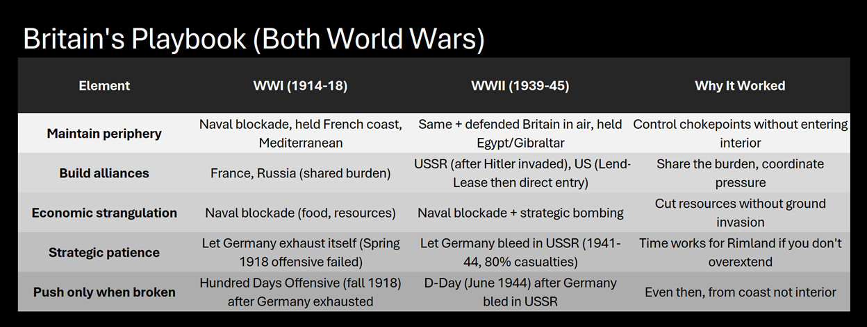 Britain (both wars): Never invaded the Heartland. Built alliances. Applied economic pressure. Waited. Pushed only when the enemy was already broken.