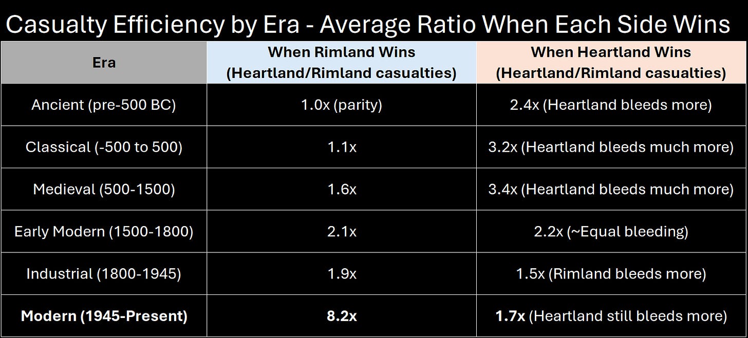 But the modern era is different in a more fundamental way. Rimland powers don’t just win more often—they win at a fraction of the cost.