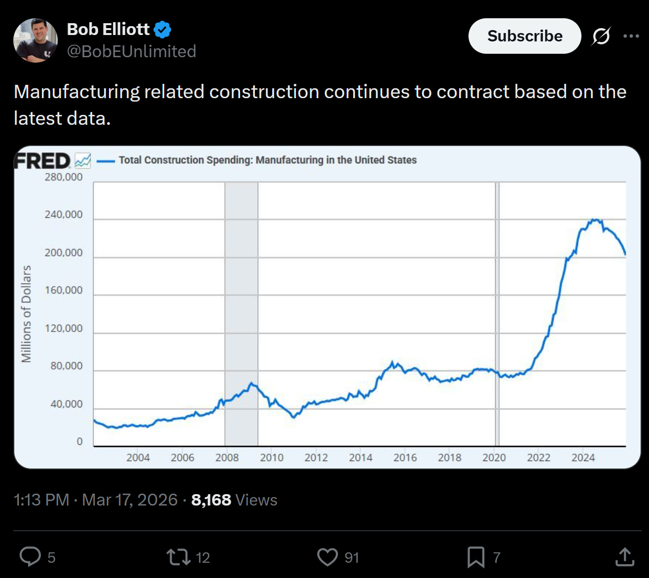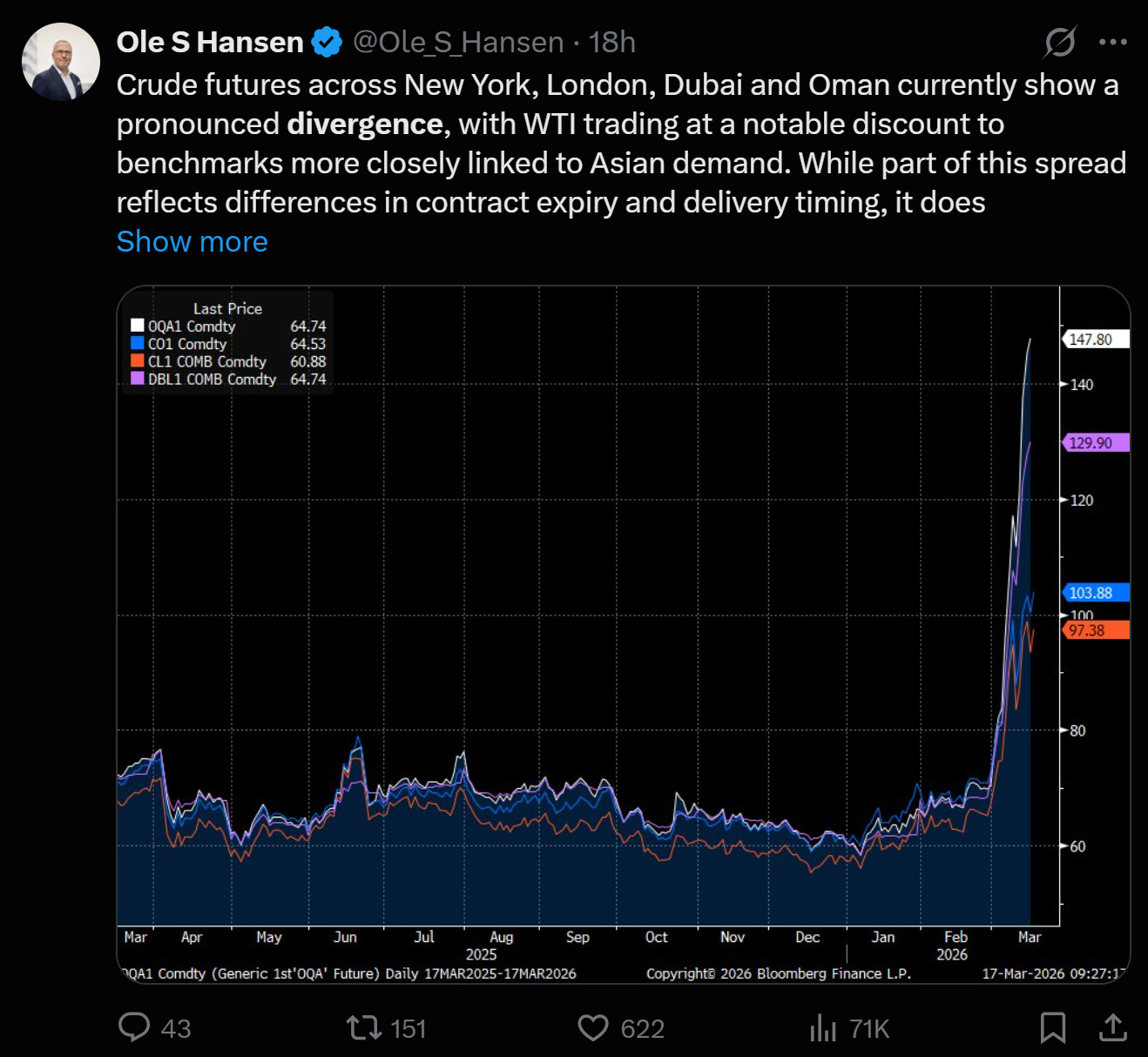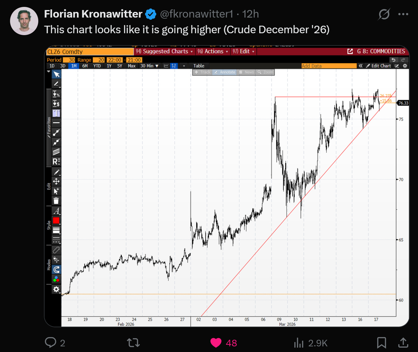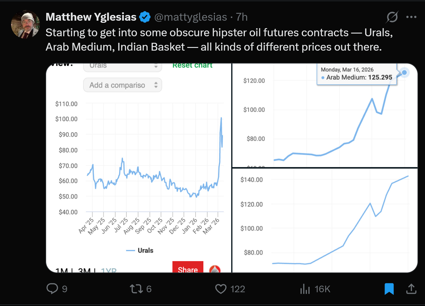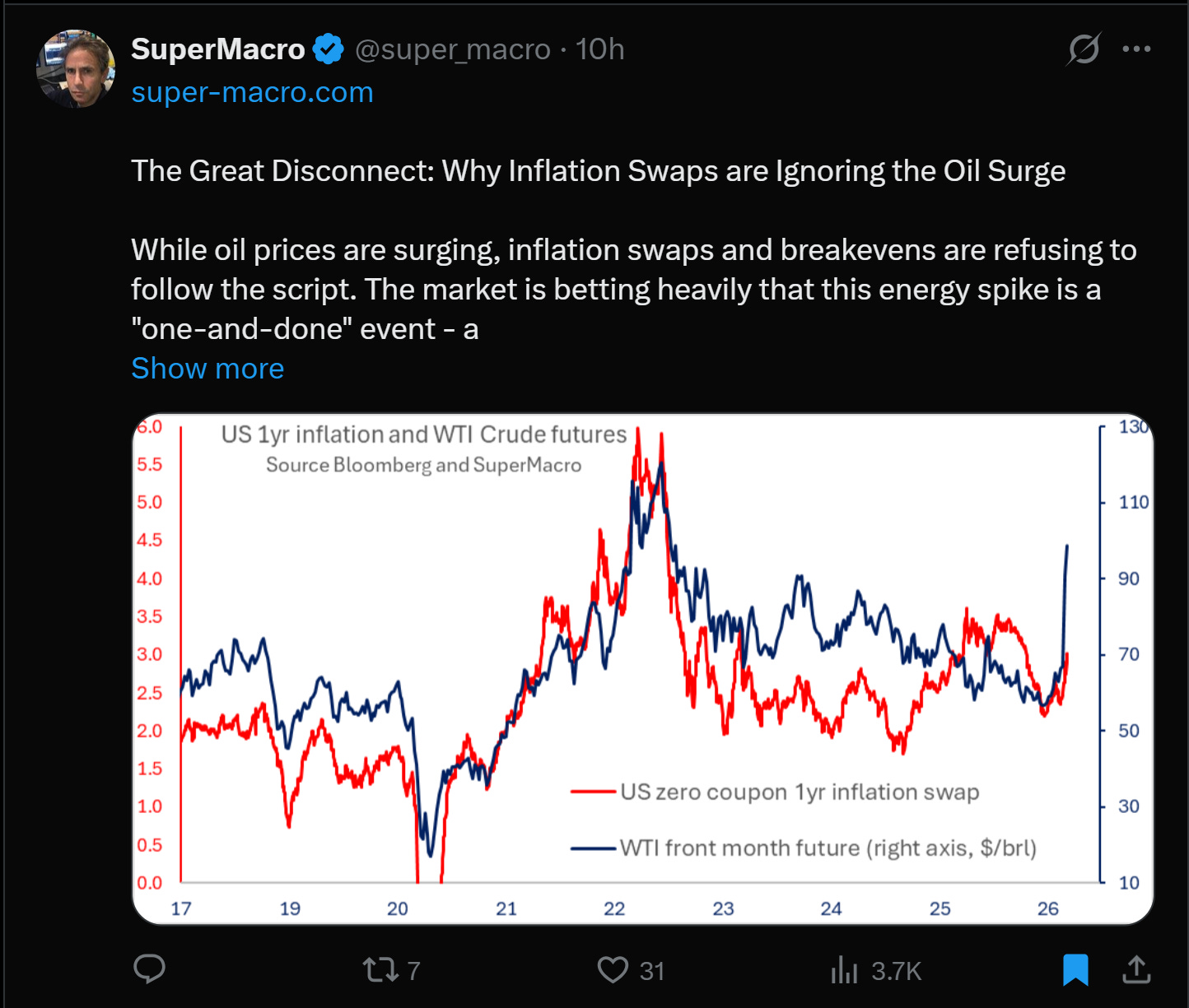 We were going to do a full gold and silver update in this piece, but we’re already 5,000 words deep and I’d rather do it justice than squeeze it into the bottom of this. That’ll be tomorrow’s post. But I’ll let the cat out of the bag: if you think the stock market is being whipped around by contravening forces, paralyzing it, the precious metals markets are in the very weird place where the longer term picture is getting more bullish (more need for currency diversification, more need for alternative stores of wealth, more need for solar panels in a world with rising energy prices), while the shorter term pressures are getting more bearish (dollar strength, higher real yields, a push to liquidity, extended volatility, high correlations with stocks, broken linkages between Indian demand and London metals markets which used to go through Dubai, Gulf capital — private and public — unable to buy, or even selling to make up for lost Hormuz revenue, and ugly charts that look like ‘we are going UP or we are going DOWN, but we can’t stay here’). Deep waters. More tomorrow.