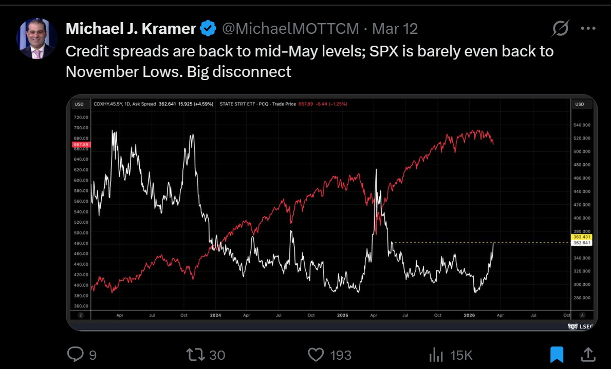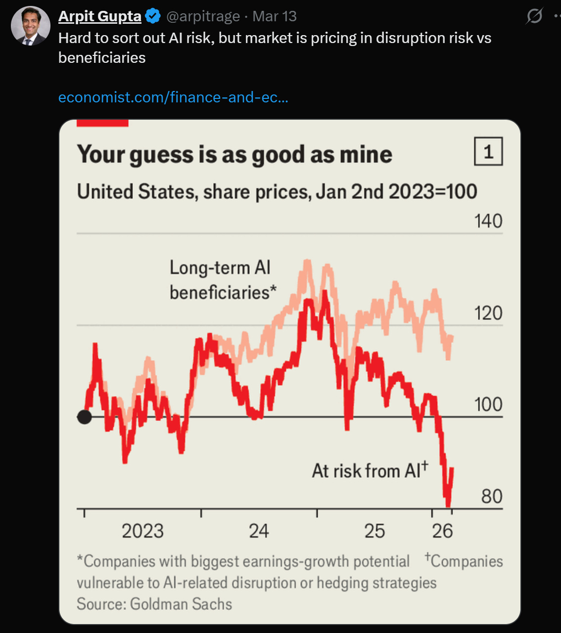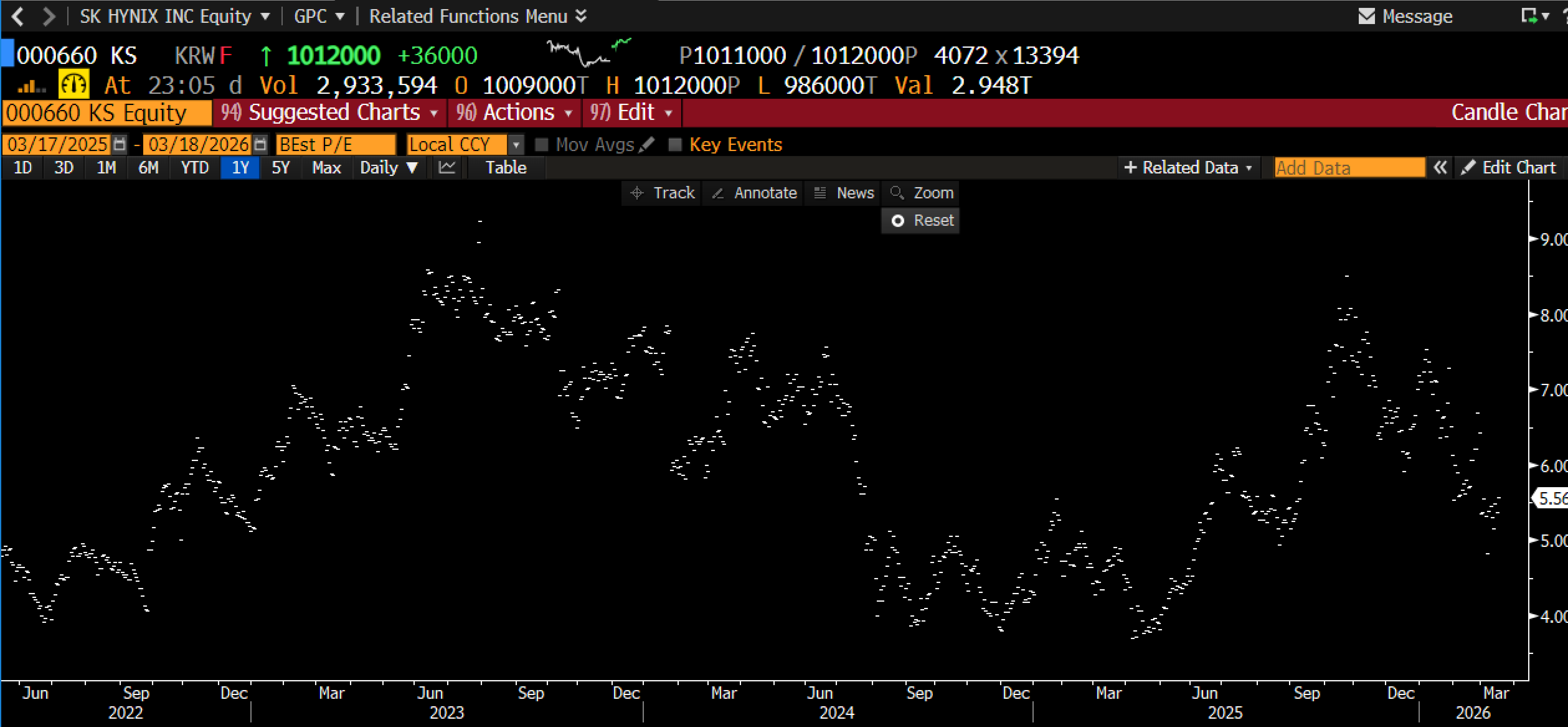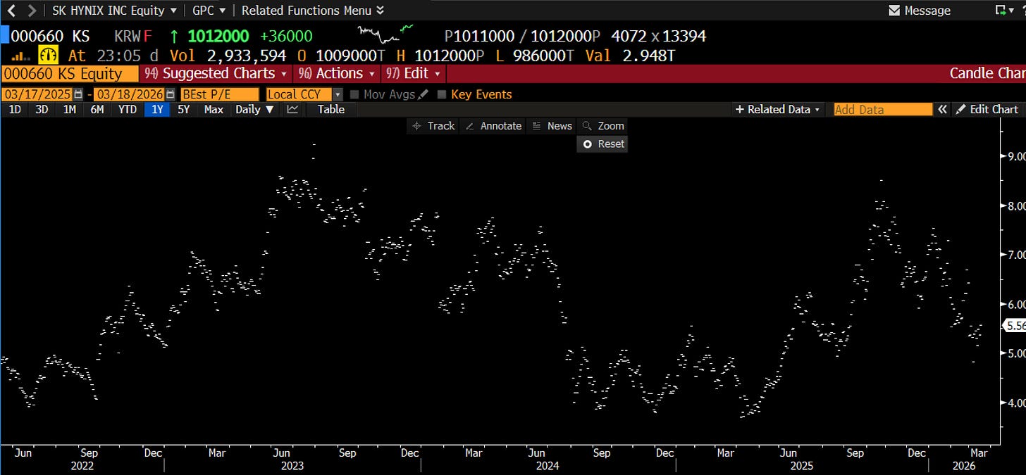 IF we get peace ASAP (which seems less and less likely every day), oil comes back down, the inflation comes out of the system and sure there’s some supply chaos, but it’s basically off to the races, the Fed (and other developed world CBs) can shift to easing and all the bets on AI (which is probably pretty much everyone’s core bet at the moment — another ‘macro bet’ in stock picker’s clothing) will ride out the vol and pay off. Heck, SK Hynix is trading with a sub-6 PE!!!!