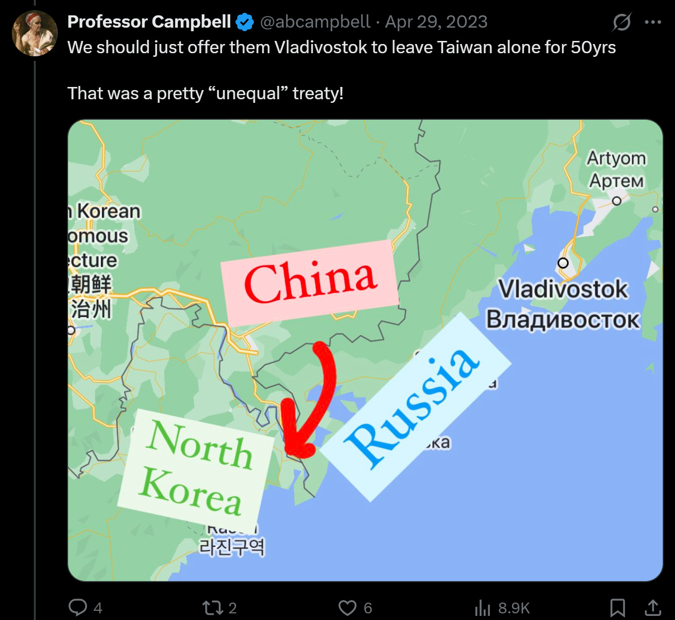 Maybe there IS a deal to be struck with Russia. Maybe it’s possible to pull them, ever so slightly, out of the Chinese sphere of influence. After all, Vladivostok, the eastern ports, and all that nice farmland is RIGHT there, and oh wouldn’t it be a shame if the conflict in Europe tore them into a hundred pieces and China picked up the best parts of Siberia, which after all, were robbed from them by European colonialism during their century of humiliation.