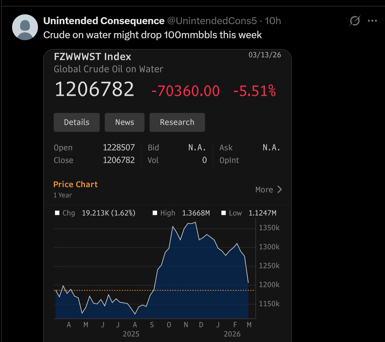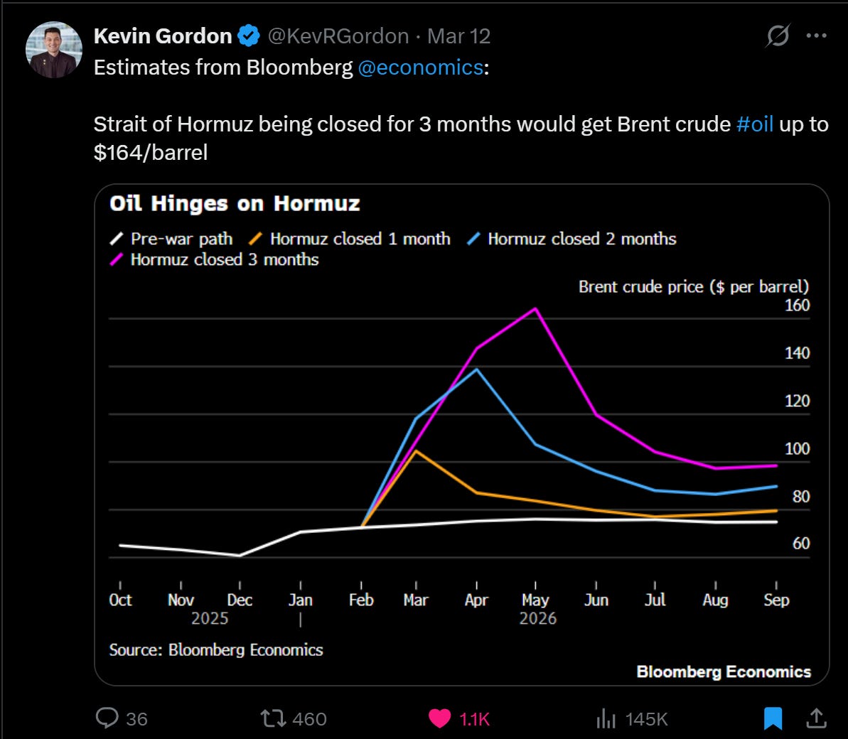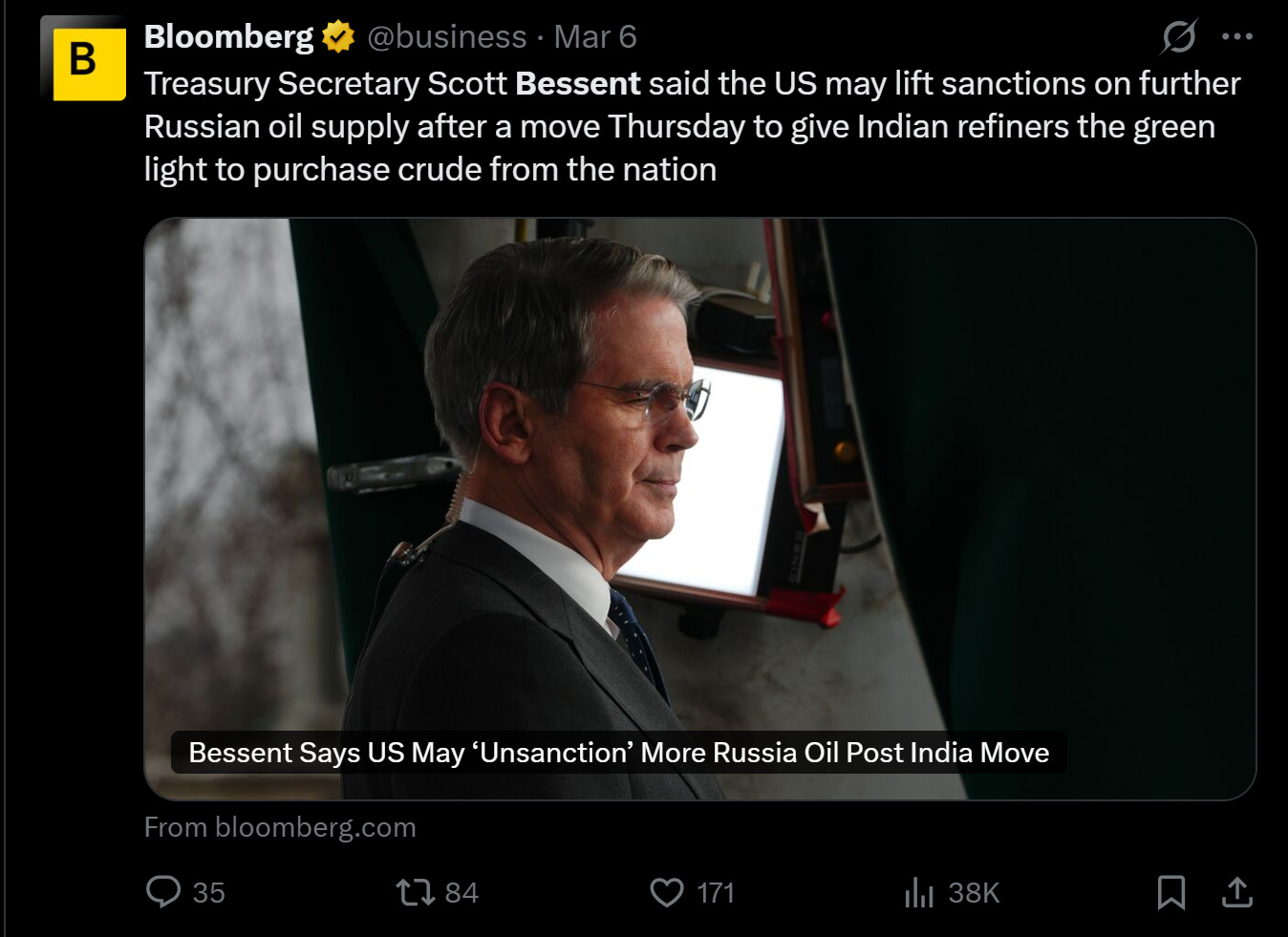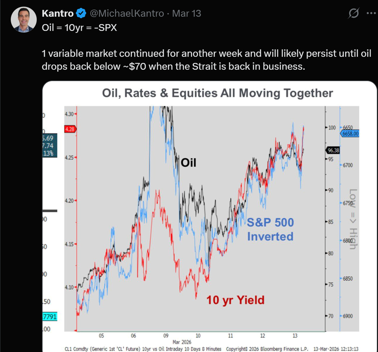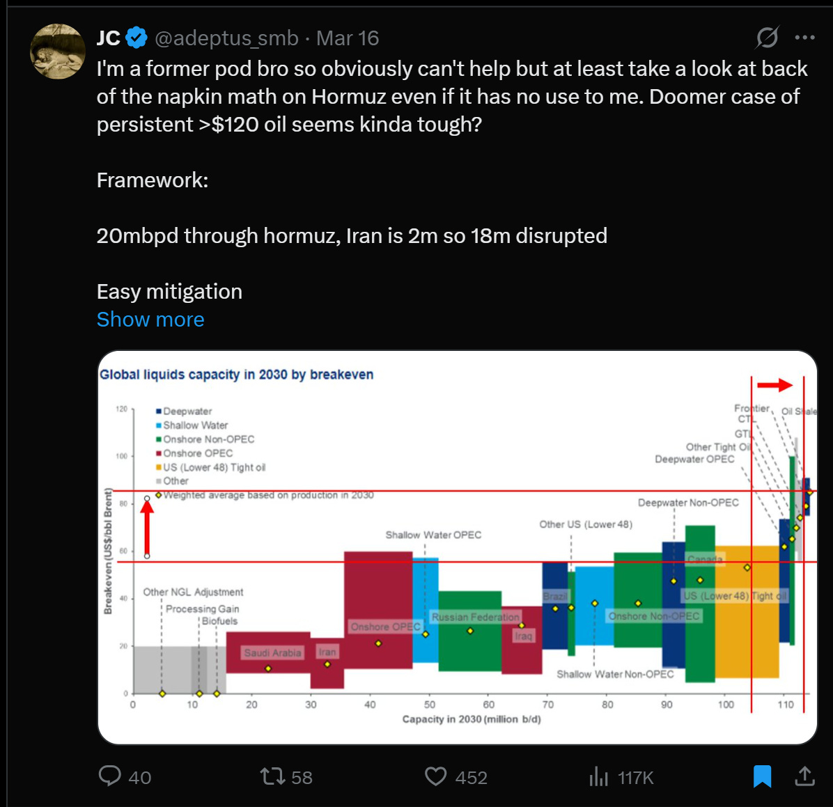 Rather than try to be the hero and call the top or bottom of the oil market (basically impossible), or try to perfectly hedge out all the war/oil risk (also impossible), the implication is simpler than that. Take down risk. Preserve your bullets for when things are actually clear. I see a lot of people right now going into hero mode or trying to craft the perfect hedge while options are expensive and correlations are deeply uncertain. That's not risk management, that's expensive anxiety.