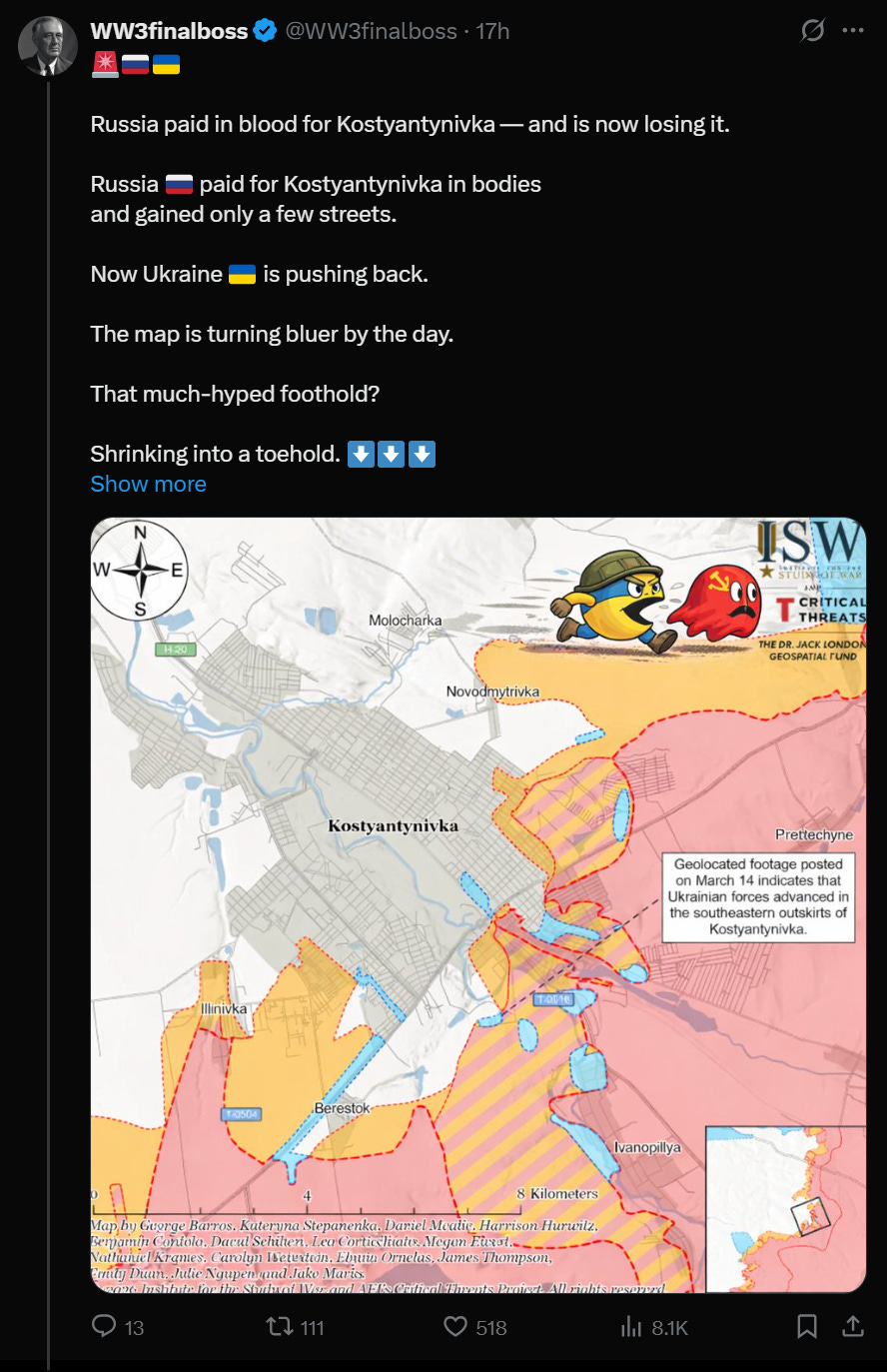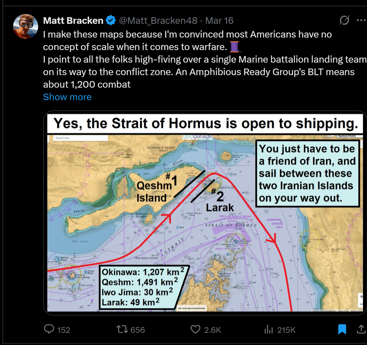 Ray and Jiang’s assumption is that the only way to ‘win’ Hormuz is to go in and physically control it. Boots on the ground. Occupy the strait. Fight Iran on its own terrain, in the mountains, on the mainland. That’s the Heartland playbook, and it’s the one that would actually end the empire, because that’s where empires go to die. Ask the Soviets in Afghanistan. Ask the US in Iraq. Ask literally anyone who’s tried to hold the interior of the Middle East by force.