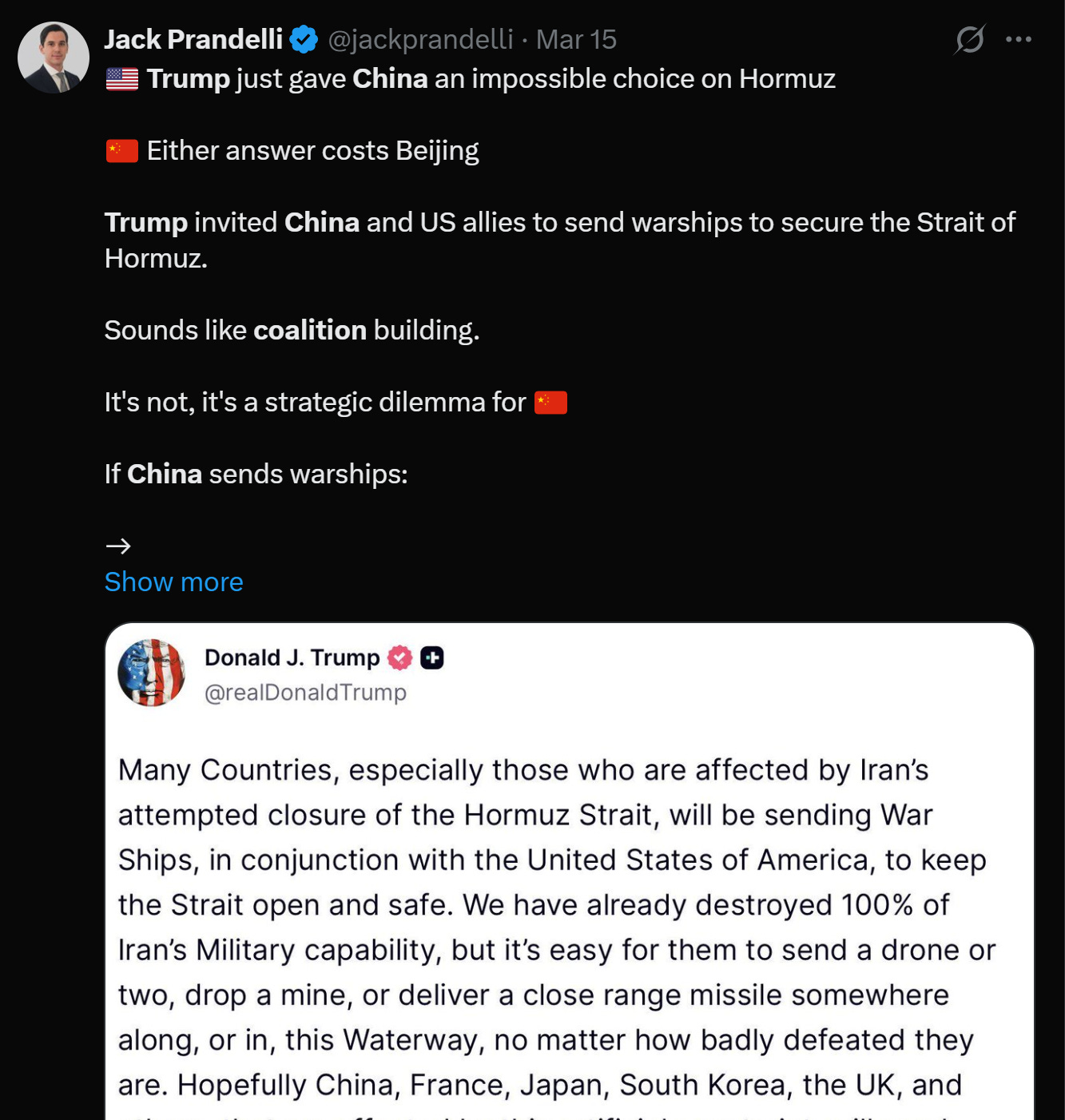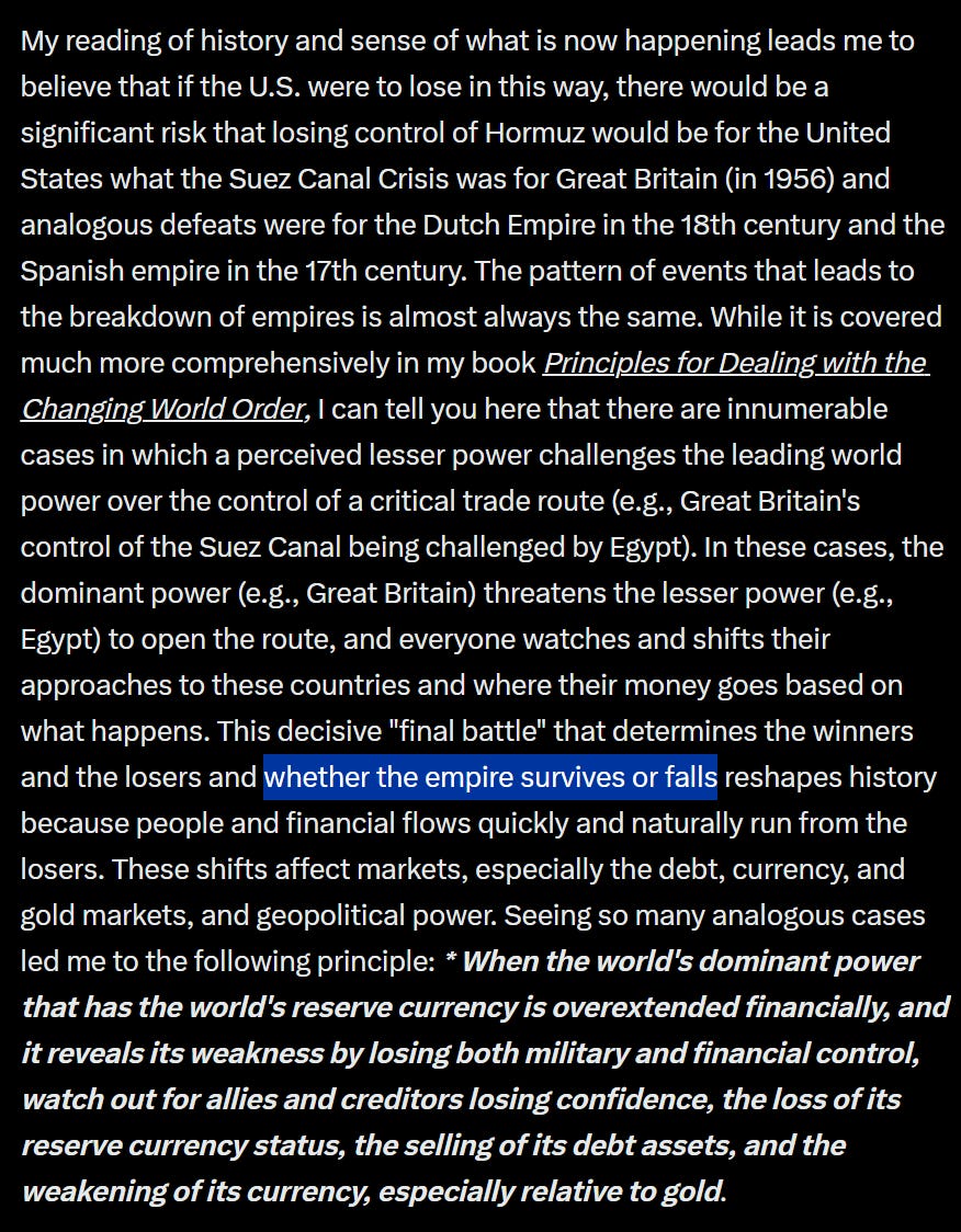 The real trap is letting the Heartland framing dominate the conversation. Ray sees this as Suez 2.0 because he’s pattern matching to empires that lost control of chokepoints by failing to project power INTO them. But the US doesn’t need to project power into Hormuz. It needs to project power around it. Which is what a navy and all those planes are for. Which is what the Rimland is actually good at. The game theory here isn’t ‘who controls the strait,’ it’s ‘who controls the sea,’ and that one’s not even close.