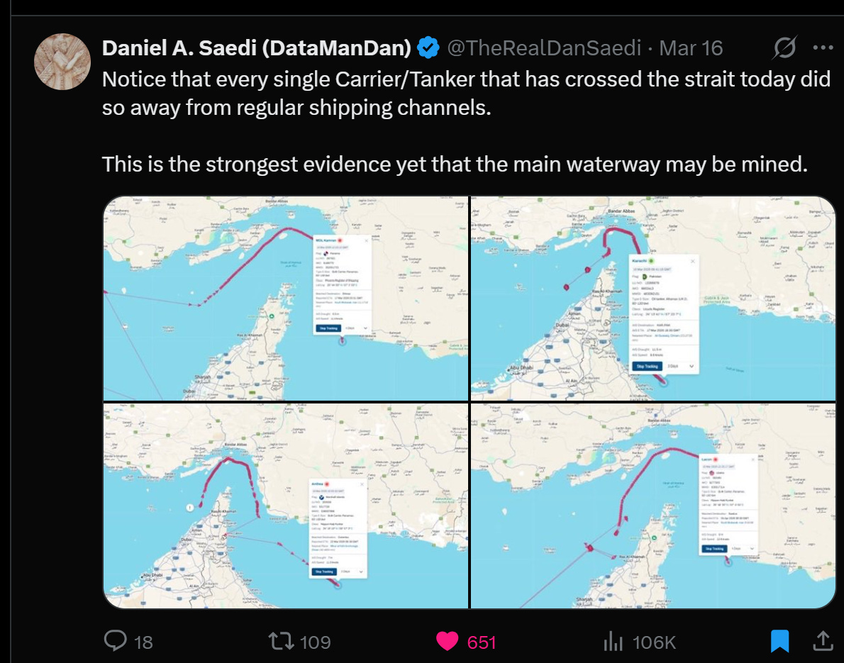 But the US doesn’t have to play that game. It’s a Rimland power. It has aircraft carriers. It IS the sea. Iran’s whole leverage here comes from strangling one chokepoint. From LARPing as a Rimland power vis-a-vis the Gulf states. Fine. But think about what that actually means for them. They need to export oil too. Their ships are on the water too. Their economy runs on selling crude to China, and that crude has to travel through waters the US Navy controls far better than Iran does.