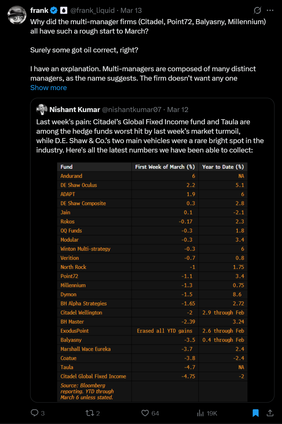 Why was the beginning of March so tough for folks? Well, in part because a lot of them weren’t positioned for the war (not that you would expect them to be), and in part just due to the kind of volatility we saw at the beginning of last week (was it last week? wow feels like one of those time warps where time slows down and speeds up at the same time).
