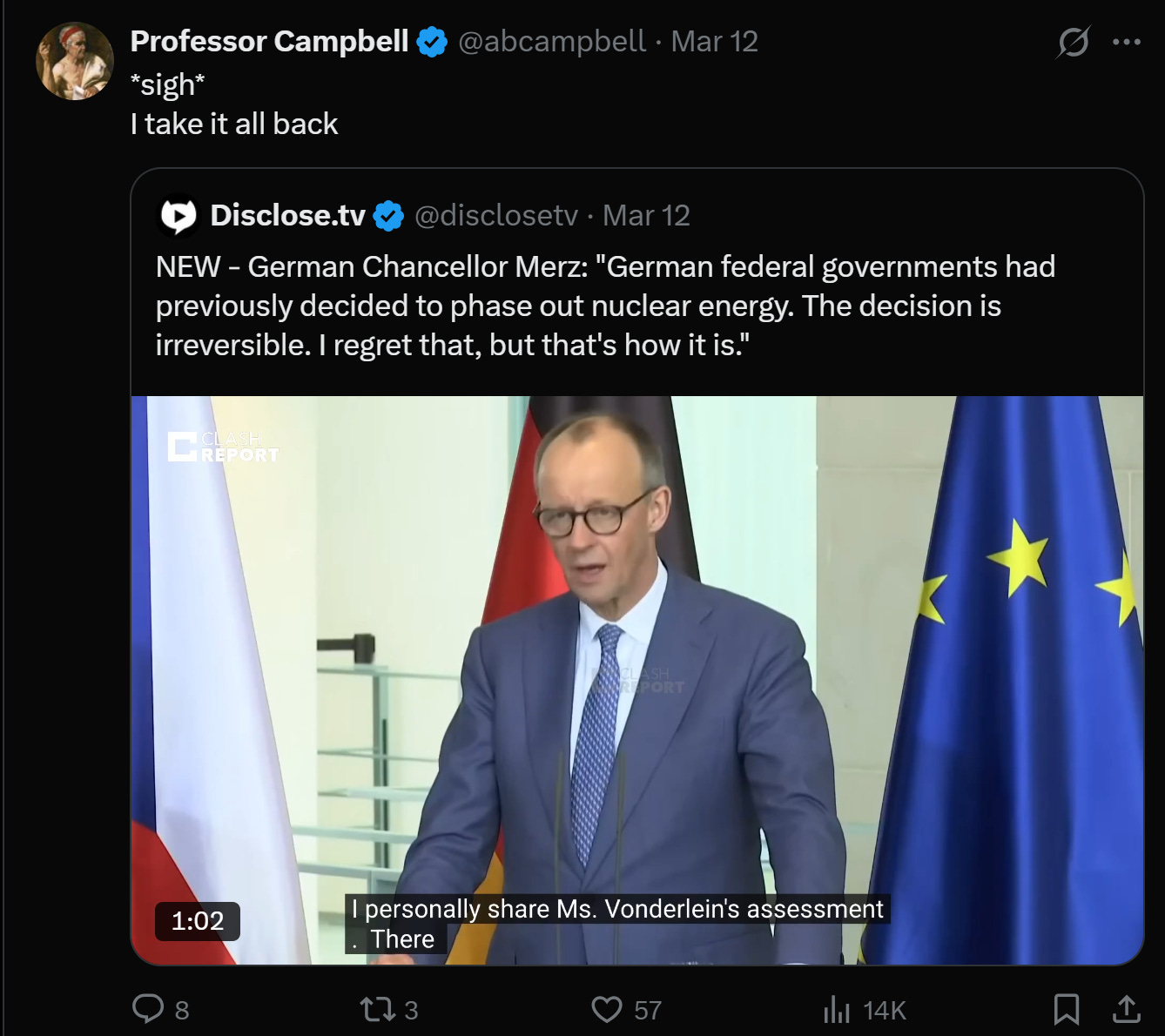 Call it wishful thinking, but like Germany and Russia in 1940, the Sino-Russo alliance is NOT stable, and wouldn’t it be the ultimate coup for Trump if the conflict in Iran opened up the trade space with Russia to bring them back into the European fold. Not only would it chill out all the WW3 talk, but it would solve Europe’s energy problems, without which their economies might just collapse in a heap of debt and failed promises. Again, call it Campbell’s wishful/delusional thinking (the counterweight to Prof Jiang/Professor Dalio’s end of the American empire vibes) but it’s on the table now.