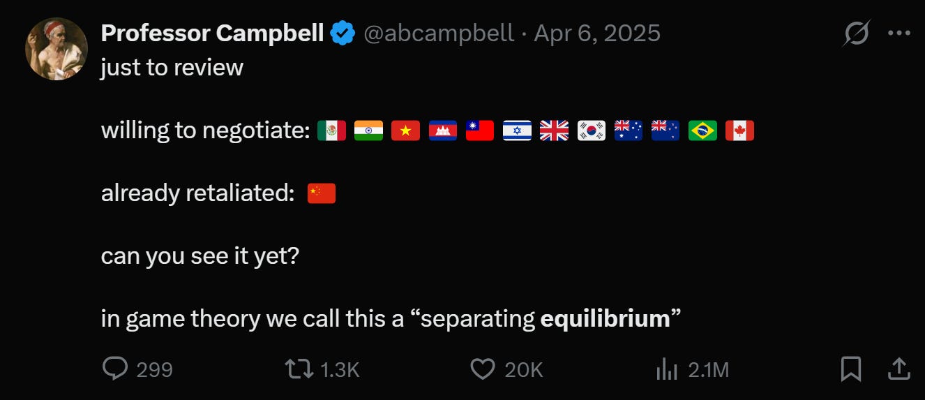 Low information folks might see this as flailing, but it’s really an extension of the ‘separating equilibrium’ strategy I identified almost a year ago back in the era of Liberation Day. Sometimes the only way to plan a party is to ask people to help plan it, that’s when you see who your real friends are. Otherwise you end up with a lot of ‘cheap talk’ yeses, a bunch of flakes, and too much guacamole.