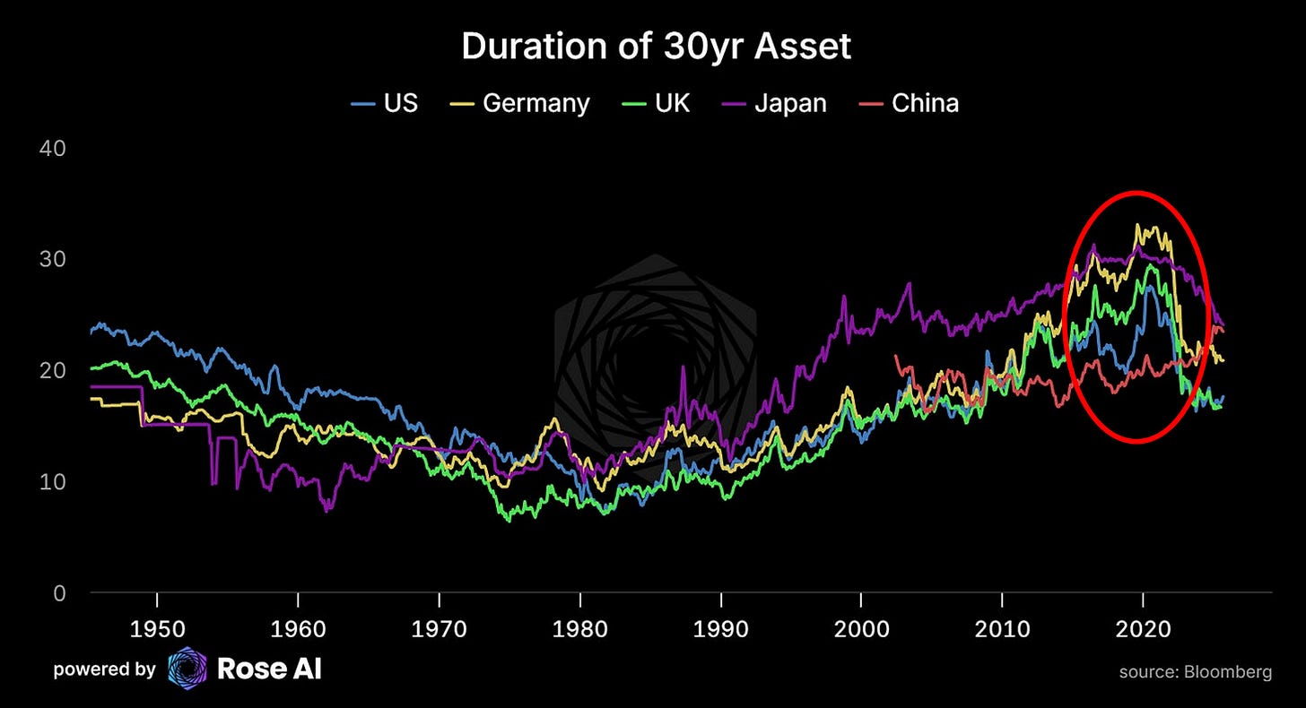 These were connected through US Treasuries. At the time, developed world rates were at all-time lows due to a) post-crisis hangover and b) emerging market central banks accumulating reserves. This pulled down risk-free rates, which ironically pulled UP the duration of long-dated assets.