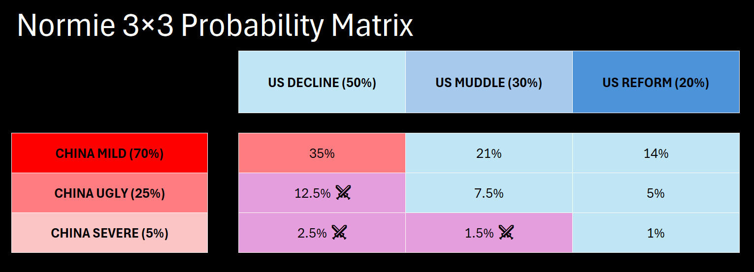 China Severe + US Muddle (45% × 33% = 14.9%)