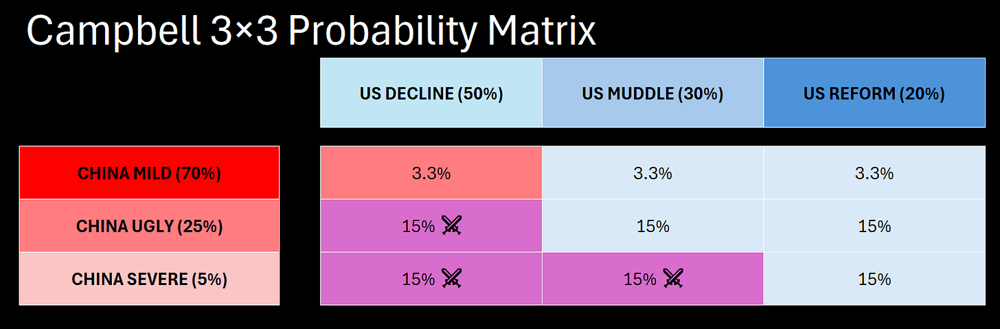 Why these three? When China faces Ugly/Severe crisis AND we’re Declining, their desperation meets our weakness. When China is Severe and we’re Muddling, they calculate the window is closing and roll the dice. But when China is Mild OR we’ve Reformed, deterrence holds.