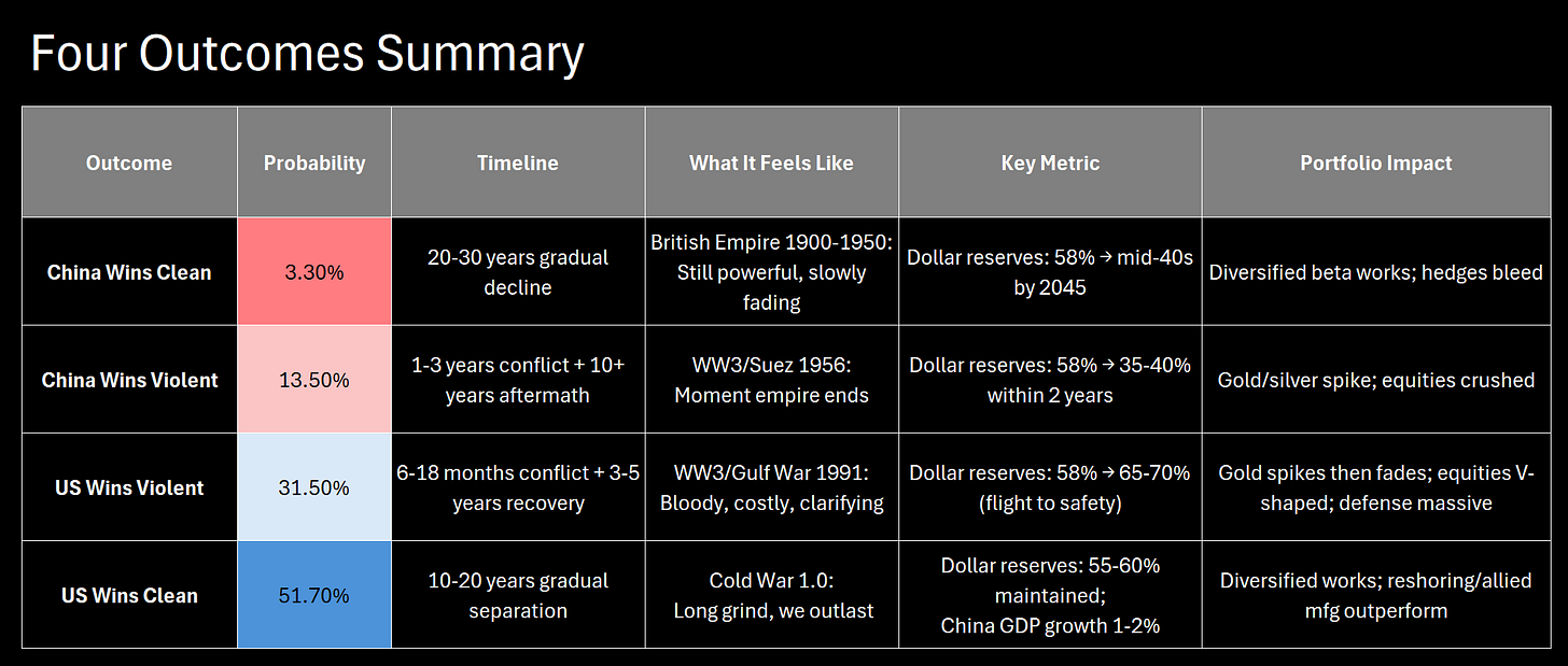 They bleed, we build. No major war. Rare earth independence 2027-2029. Over 15-20 years: their growth drops to 1-2%, capital flight continues, demographics crater. Feels like: Cold War 1.0. Long grind, we outlast them. This is my base case—but you need hedges for the 48% where it’s not this.