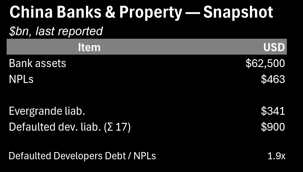 Take Evergrande. Defaulted in December 2021. Still unresolved as I write this in late 2025. Why? Because if they admit most lenders won’t get paid back, domestic banks have to take losses.