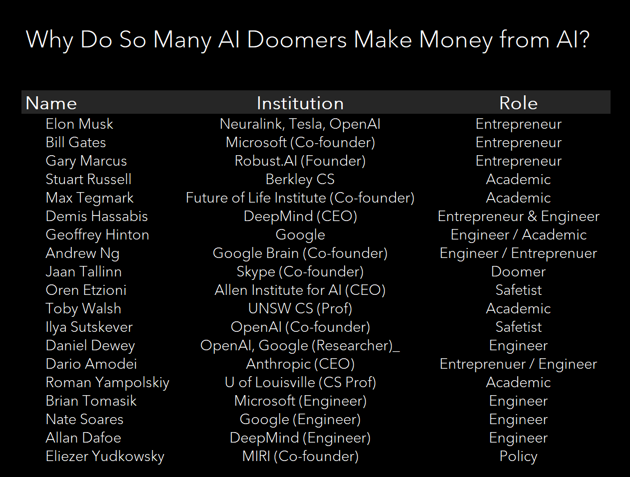 Not only that, but a huge proportion are currently in the business of AI, be it as CEOs, scientists, engineers, or talking heads.