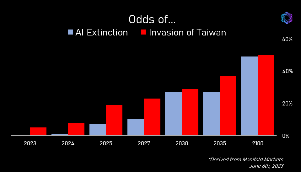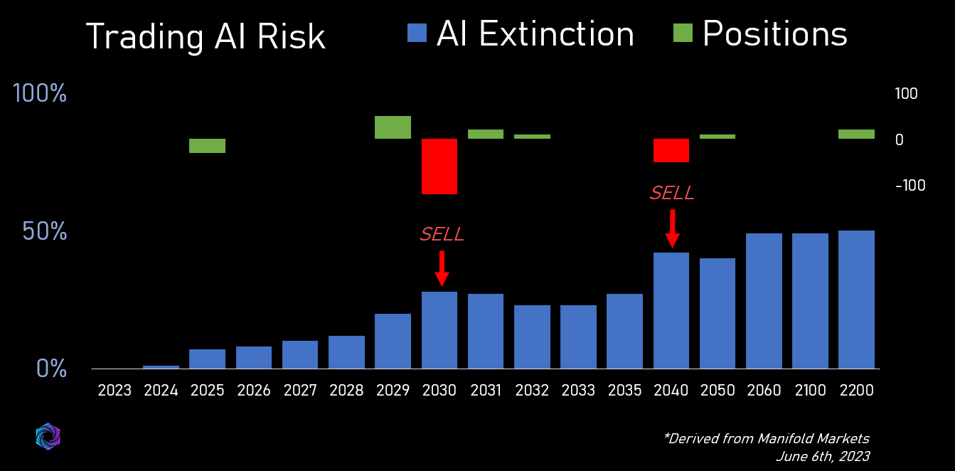 Keep in mind, these ‘prediction markets’ are also the same markets that had a hard time keeping rational expectations back in June. In June, 2030 existential AI risk was trading higher than the same risk all the way out to 2040. Aka, we’re more likely to die from AI by 2030 than 2031. Which, is impossible, because the risk of dying from AI in 2030 is included in the risk of dying from AI in 2031, etc.