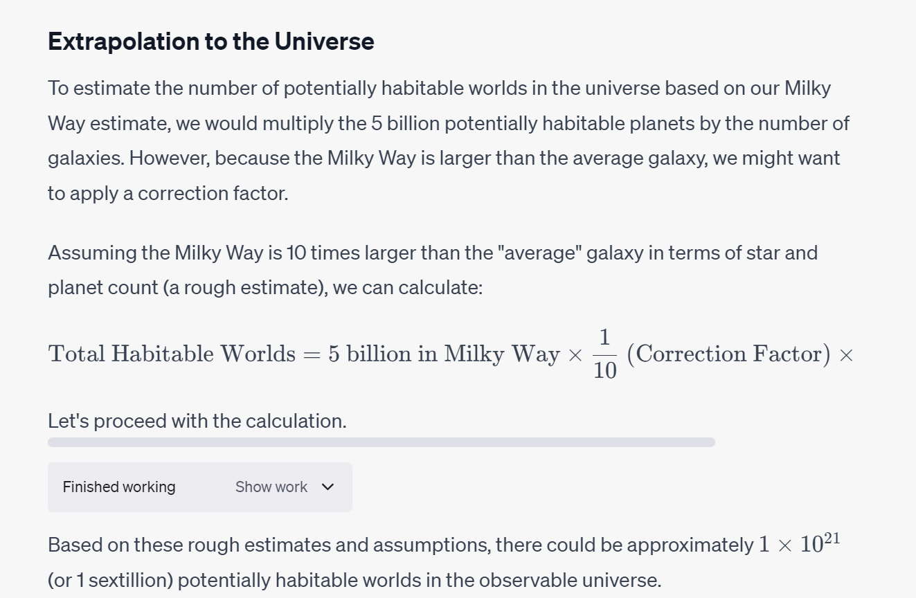 Zooming out even further, and considering all the galaxies in the universe gets you the realization that there are billion * billion potentially habitable worlds in the universe.