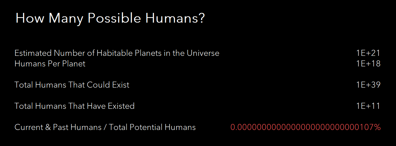 Meaning, were you to cut humanities path short, you would be implicitly killing ~1x10^39 humans. I’m not even sure what the name for that is.