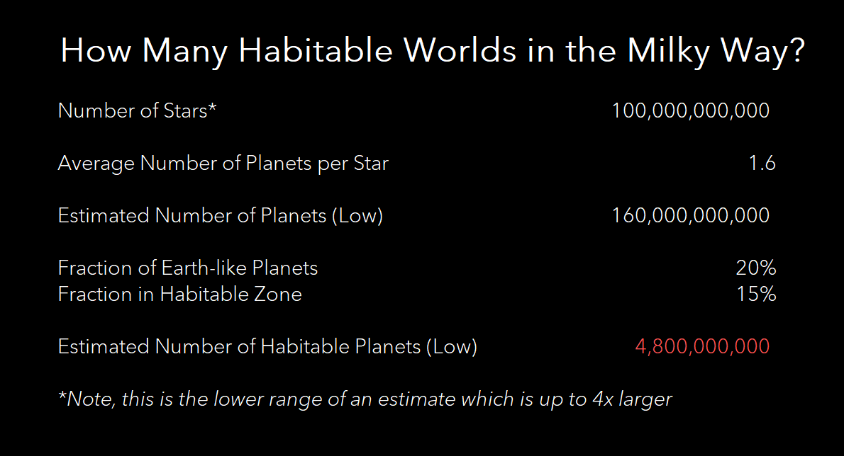 Meaning, when you allow for the lower bound estimate of stars, there’s probably about a habitable world for every person on earth.