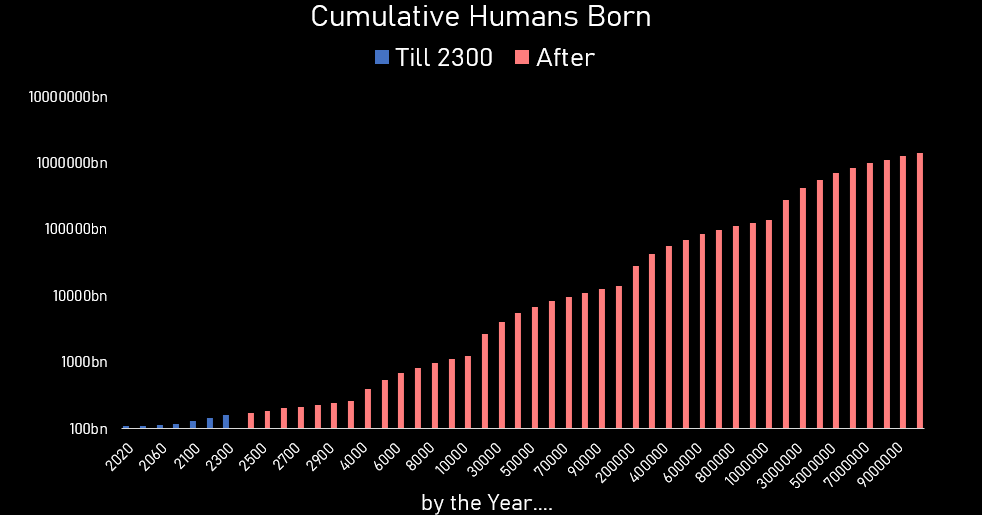 Put another way, by just the year 10,000AD all the humans that have currently ever lived will be just 10% of the total humans ever born.