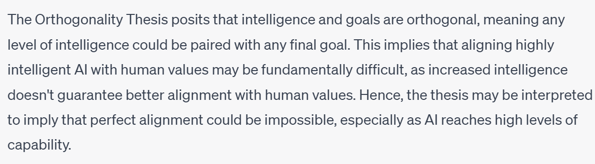 The combination of orthogonality and exponential increase in the capacity of machines basically guarantees that at some point, we will lose control of the machines, they will become ‘misaligned’, decide to only make paperclips (or something similarly against humanities interests), and thus need to eat us for our atoms/energy/negative entropy.