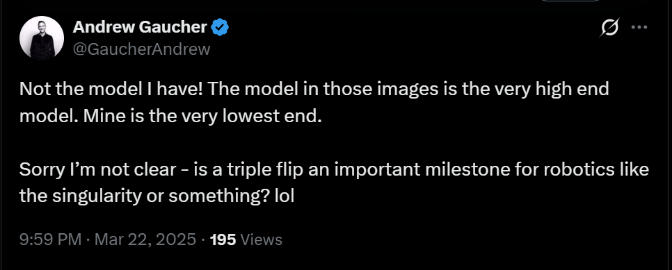 Then comes the tell: the follow-up videos never show the same thing. Someone visits the factory and films a robot walking on a treadmill. A “behind the scenes” clip shows the machine waving its arms. A demo reel features it picking up boxes. All real, all fine, but conspicuously missing the triple flip, the flying kick, the physics-defying stunt that went viral.