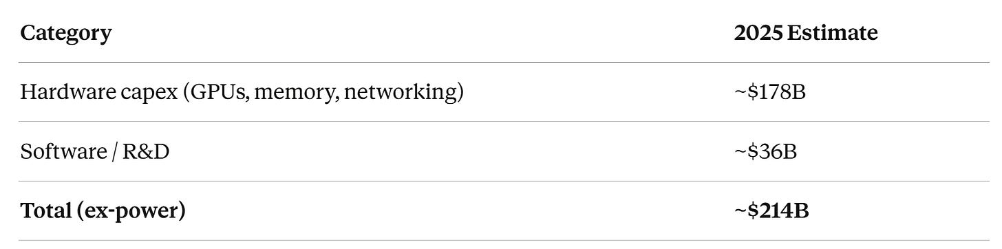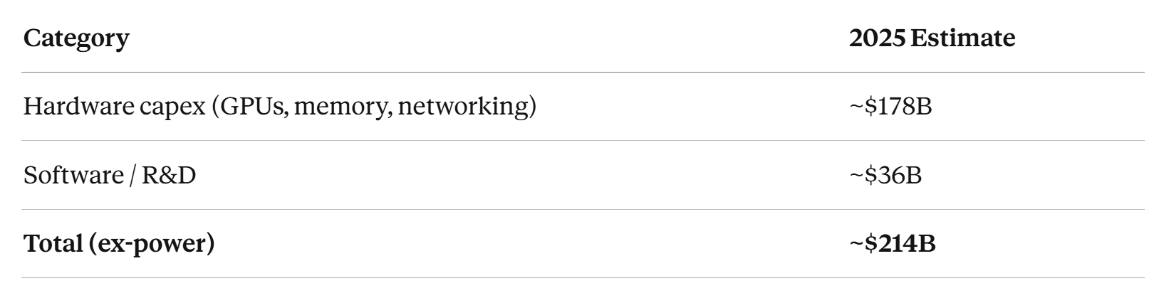 Power costs are harder to pin down and vary by region. Add another $20-50B depending on assumptions. For simplicity, use $200-250B as the target revenue needs to clear.