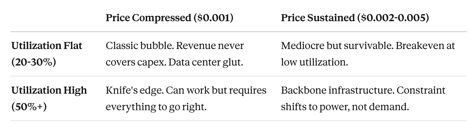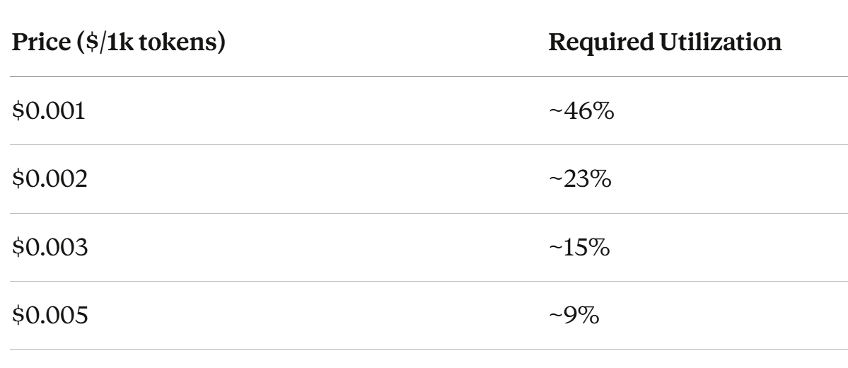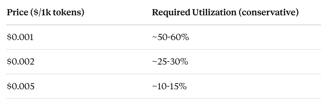 At commodity pricing ($0.001), you need utilization levels we’ve never seen in the industry. At premium pricing ($0.005), you can break even with modest adoption.