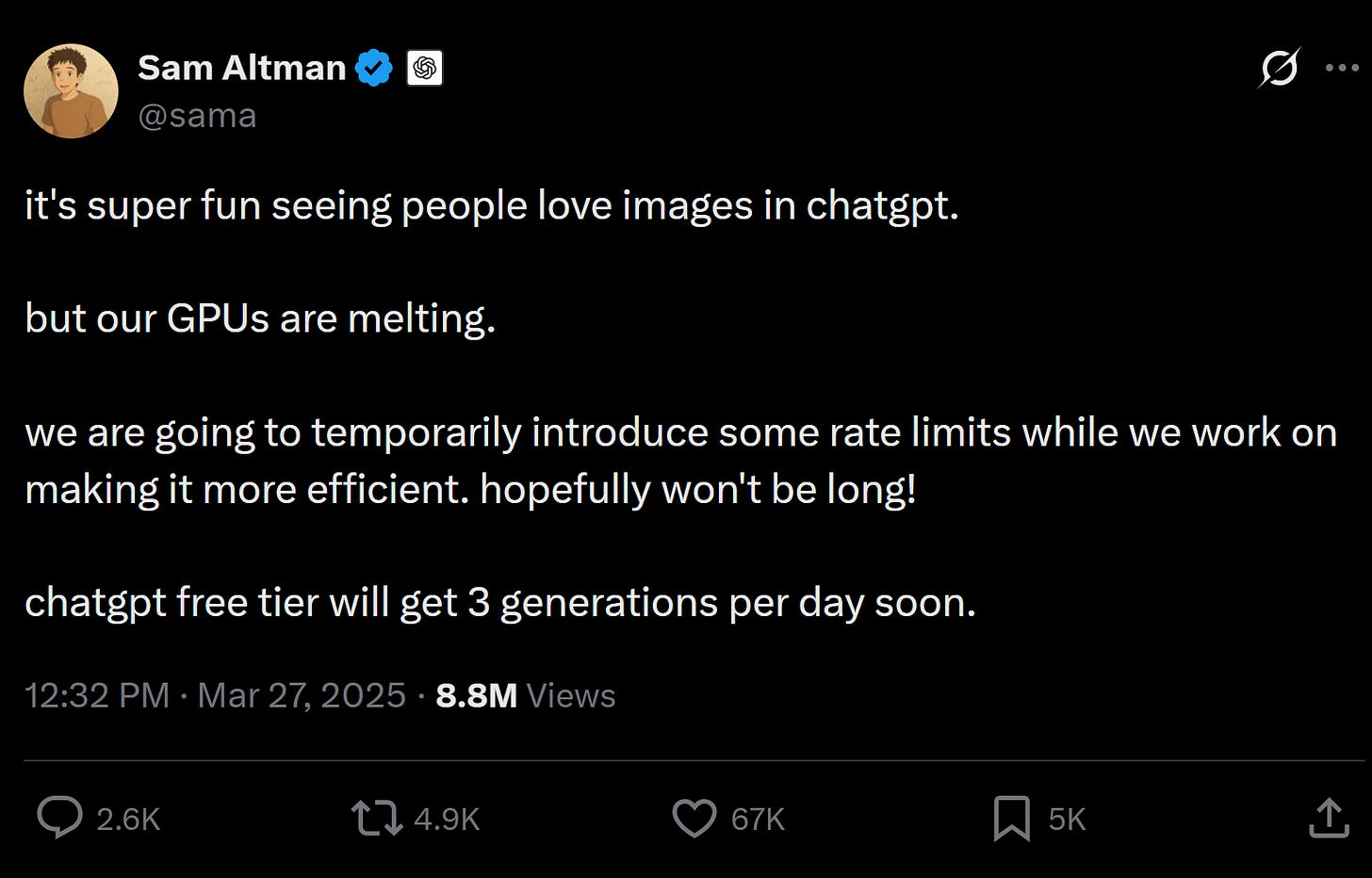 What’s much less certain is what happens next. Both in terms of the number of customers you have, as well as how often, how intense, and when they will use it. As an example, when OpenAI first released their upgraded image model, and folks found out you could ask it to “Ghiblify my profile pic” we saw an explosion of inference demand that Sam Altman said was “melting their servers.”