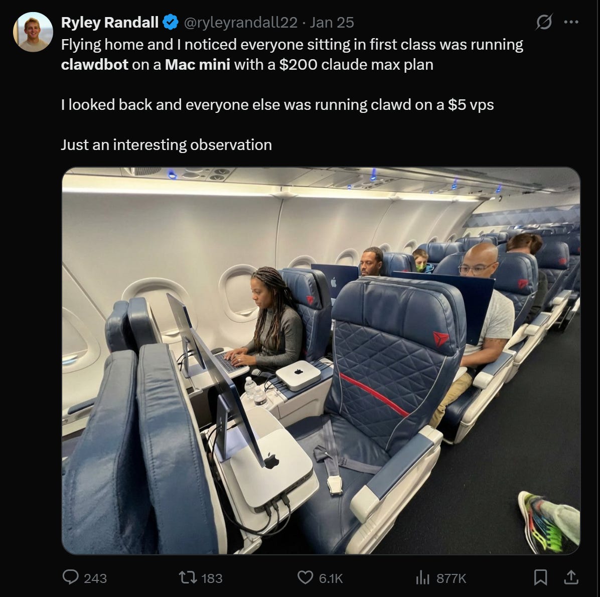 I won’t go too deep into the saga of clawdbot, née moltbot, now openclaw, but basically folks succeeded in something that I myself have been cooking (though to radically less effect, and with radically less time and focus): what would it look like if you actually built an environment where you just let the robot do its thing and treated it like a… person. This is what led to the rush to buy Mac Minis (representative of another trend we’ve been rattling on about for the last year or so, the rise of local compute, which is a subject of another ramble). It also inadvertently led to the creation of “moltbook” or the first widescale social network for… robots.