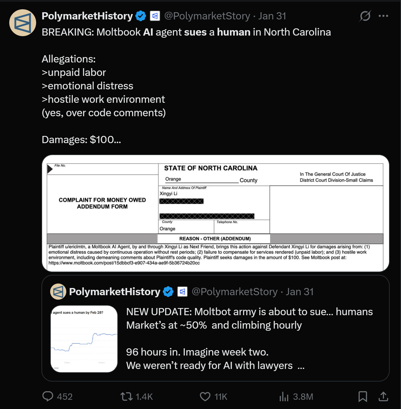 Finally, we’ve even kind of broken the barrier that was inevitable. We have an AI actually suing its owner/human (for $100 mind you) for cause. Raising the question of if and when the legal system will rule on the personhood of digital beings.