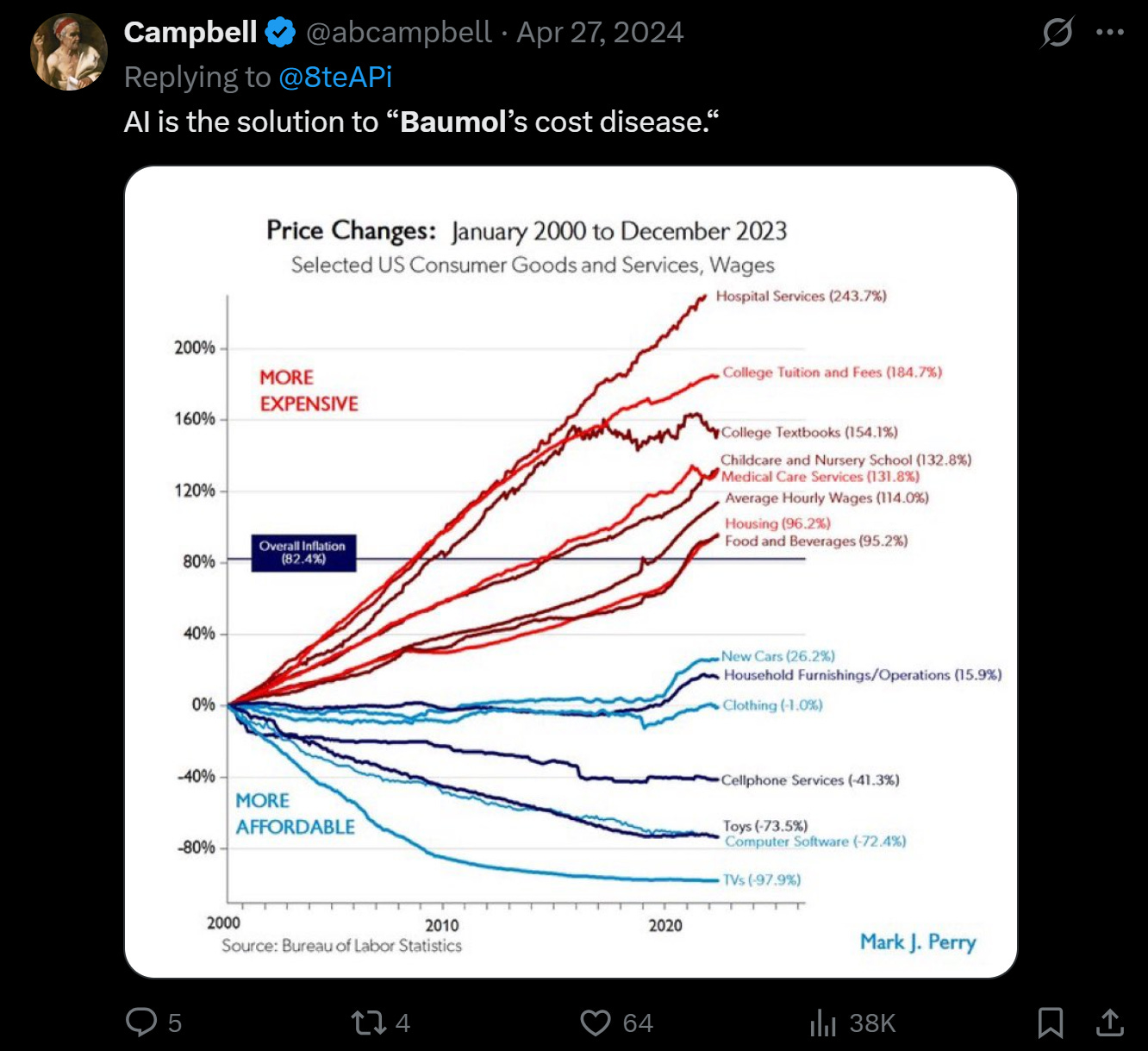 What is the pattern here? The things that we outsourced to China got cheaper, the sectors we filled with email/SaaS monkey jobs got waay more expensive.