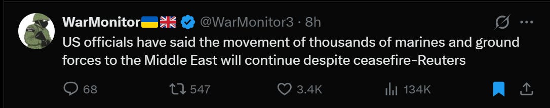 US officials announcing thousands of marines and ground forces will continue deploying to the Middle East. Despite the ceasefire.