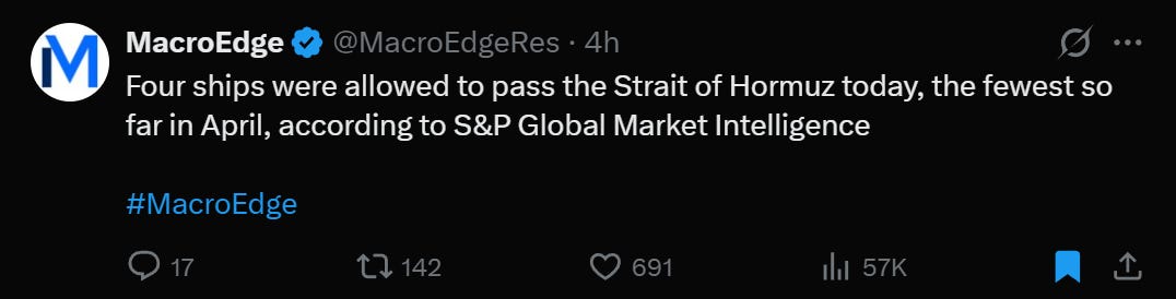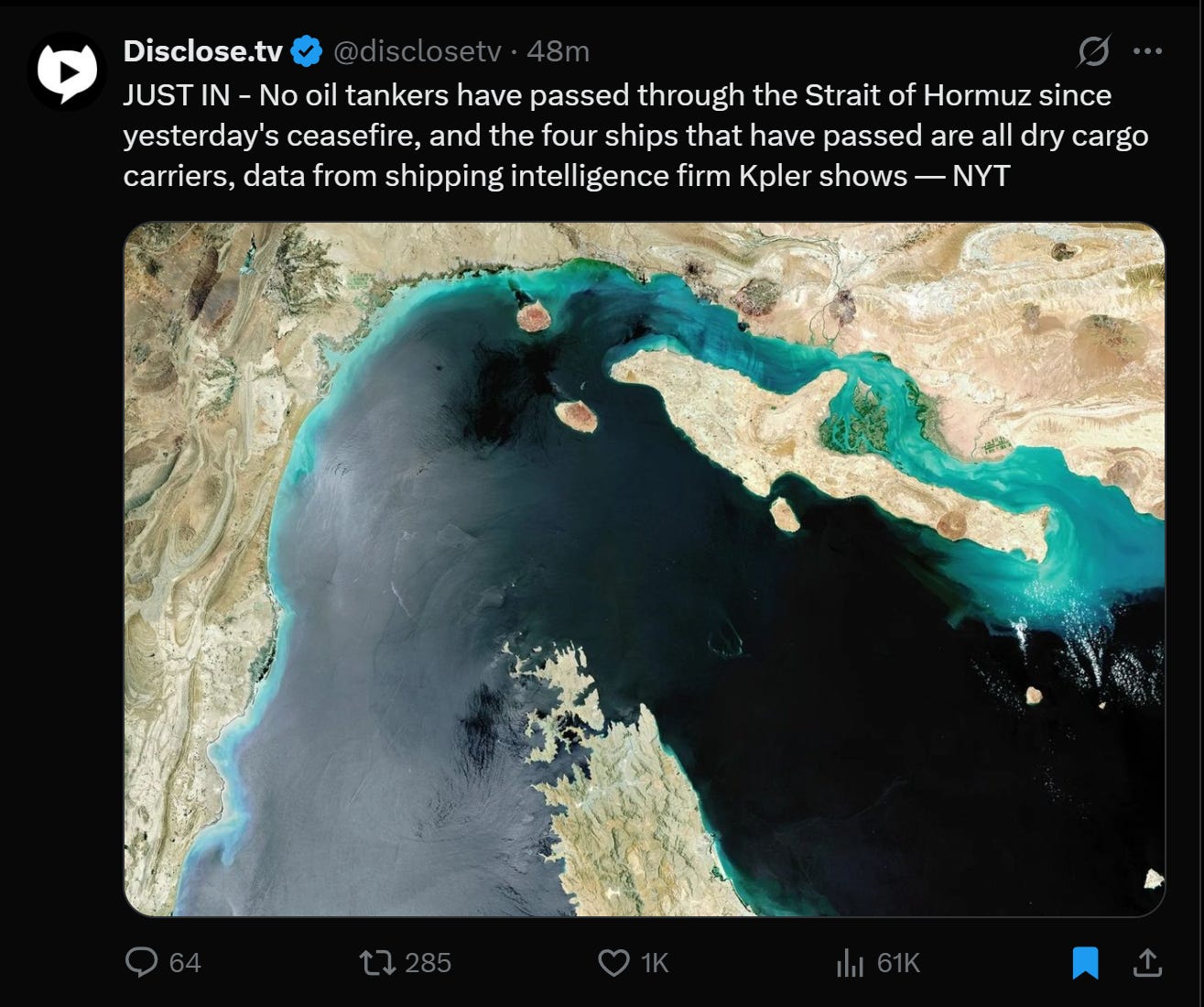 Iranian missiles hitting Gulf states on the morning of the ceasefire. Bahrain, Kuwait, the UAE all reporting fresh attacks. Iran bombing the Saudi East-West pipeline, the one piece of infrastructure the Saudis had been using to route oil around Hormuz to the Red Sea port of Yanbu. A parting gift: good luck with your Plan B.