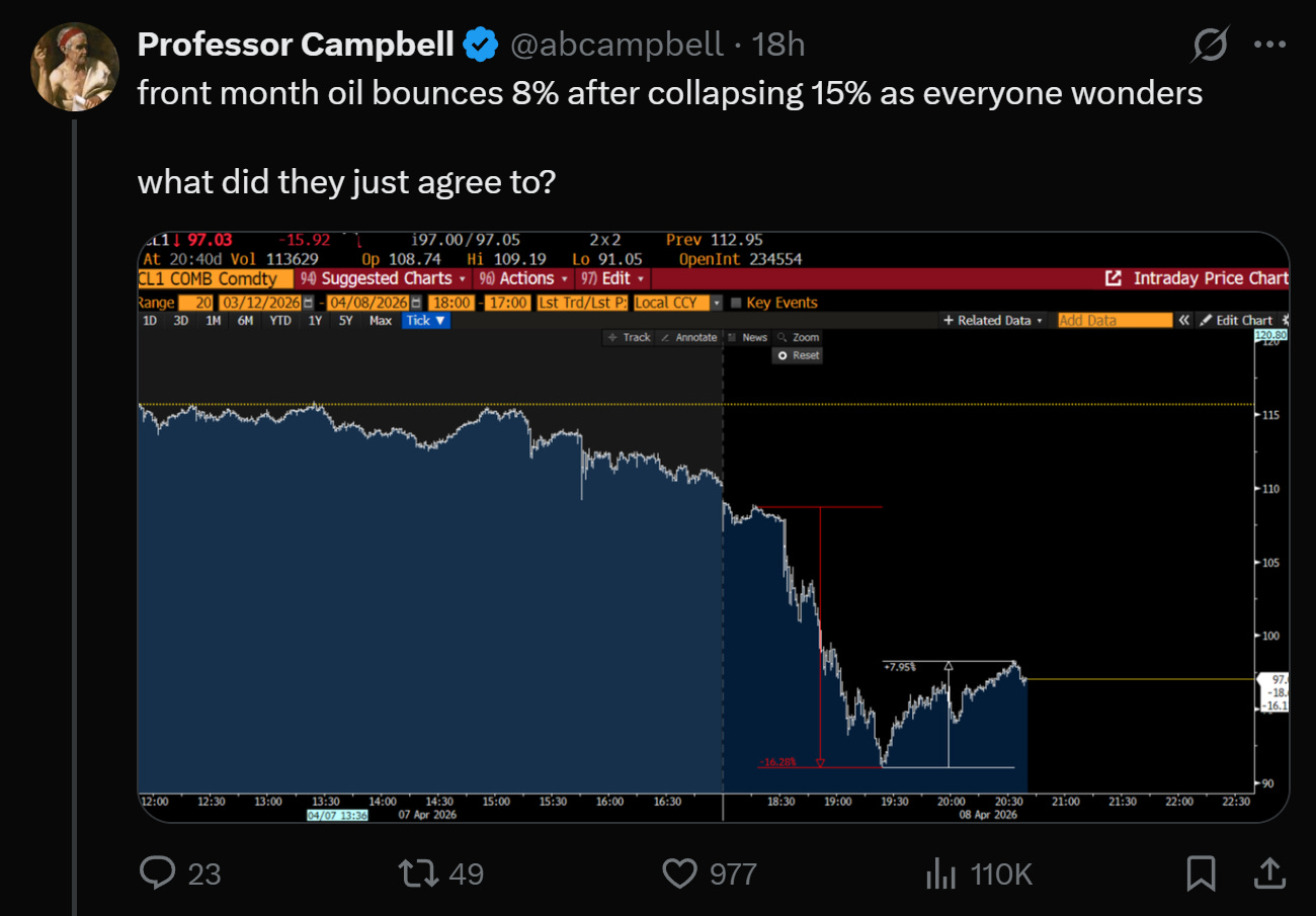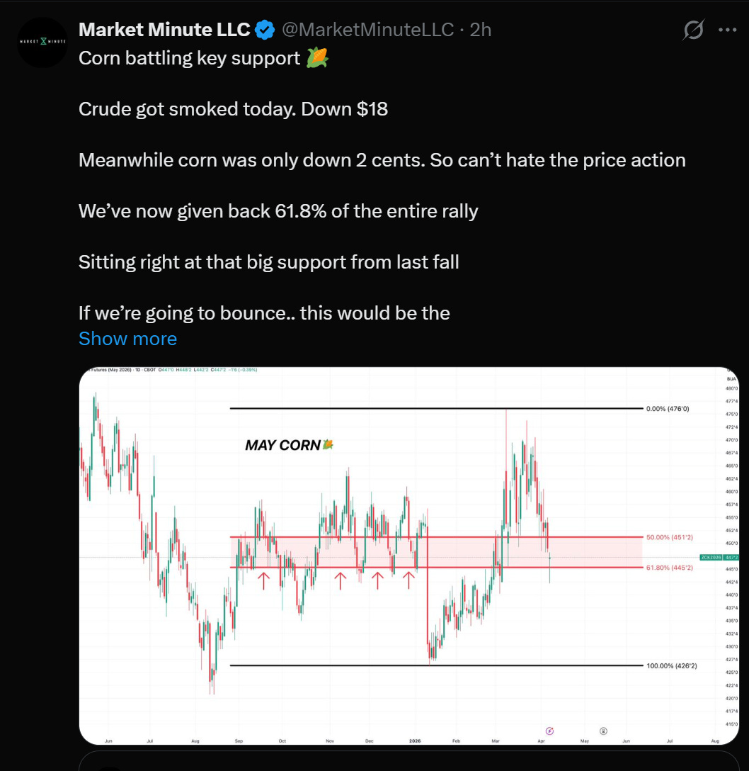 Crude got smoked. Corn barely moved. That’s the cascade in one chart. Oil reprices on headlines. Agricultural calendars don’t. Urea is still at $700. The USDA’s smallest planned wheat crop since 1919 doesn’t reverse because two diplomats shook hands. Farmers who couldn’t afford fertilizer in March aren’t retroactively applying it in April because someone in Islamabad said “ceasefire.”