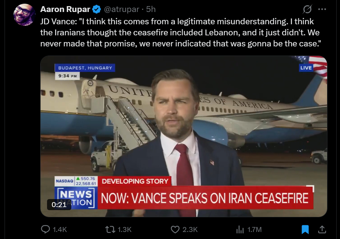 Iranian attestations that an end to the conflict in Lebanon WAS part of the deal. Trump and Vance saying it wasn’t. Israel proving the point by bombing Beirut, Tyre, and the southern suburbs while the ink was still wet.