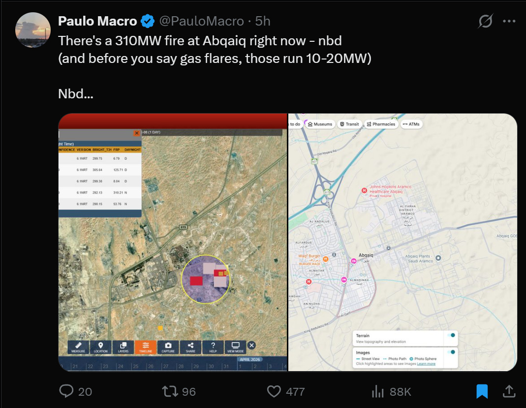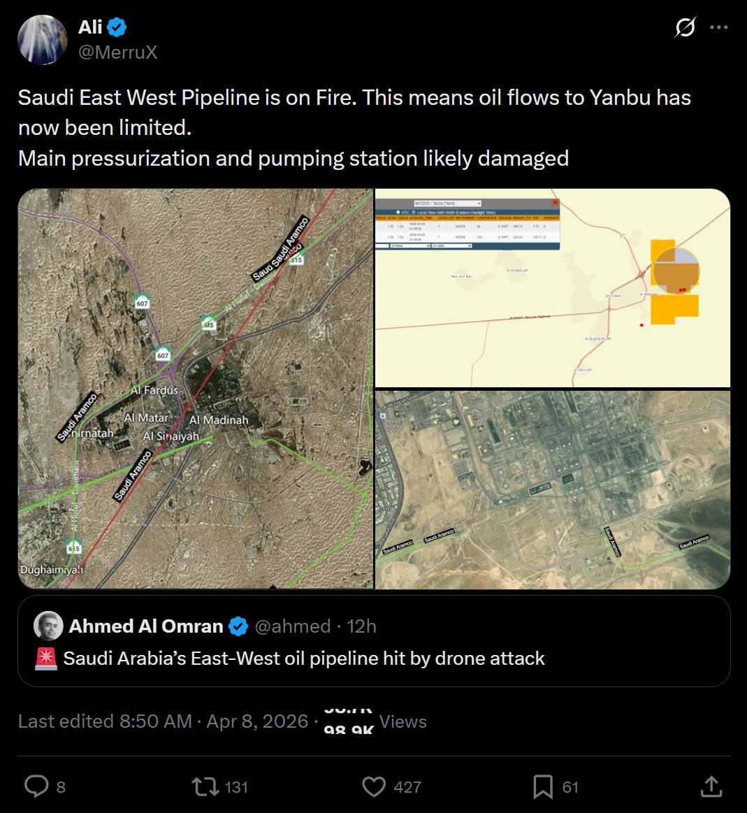 The Saudi East-West pipeline was hit hours before the deal. Main pressurization and pumping station likely damaged. Yanbu flows limited. That was the Plan B.